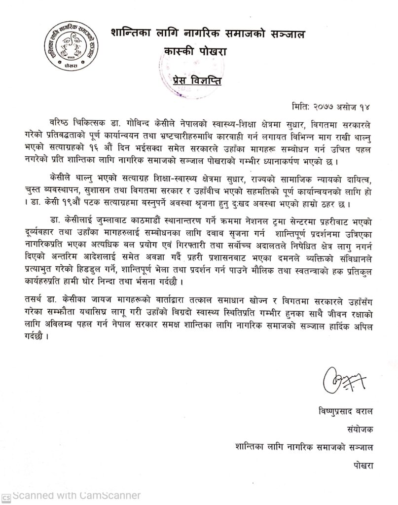 डा. केसीका जायज मागहरूको वार्ताद्वारा तत्काल समाधान खोज्न र विगतमा सरकारले उहाँसँग गरेका सम्झौता यथासिघ्र लागू गरी उहाँको बिग्रदो स्वास्थ्य स्थितिप्रति गम्भीर हुदै जीवन रक्षाको लागि अविलम्ब पहल गर्न नेपाल सरकार समक्ष शान्तिका लागि नागरिक समाजको सञ्जाल हार्दिक अपिल गर्दछौ विज्ञप्तिमा उल्लेख छ ।