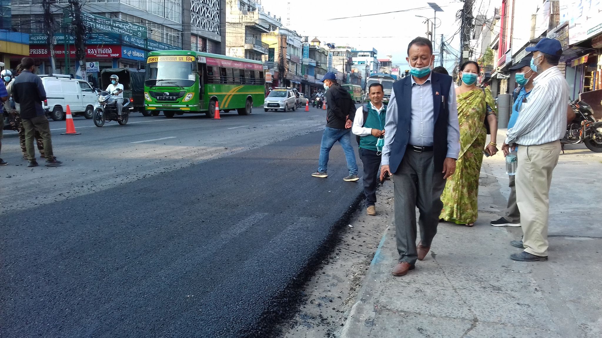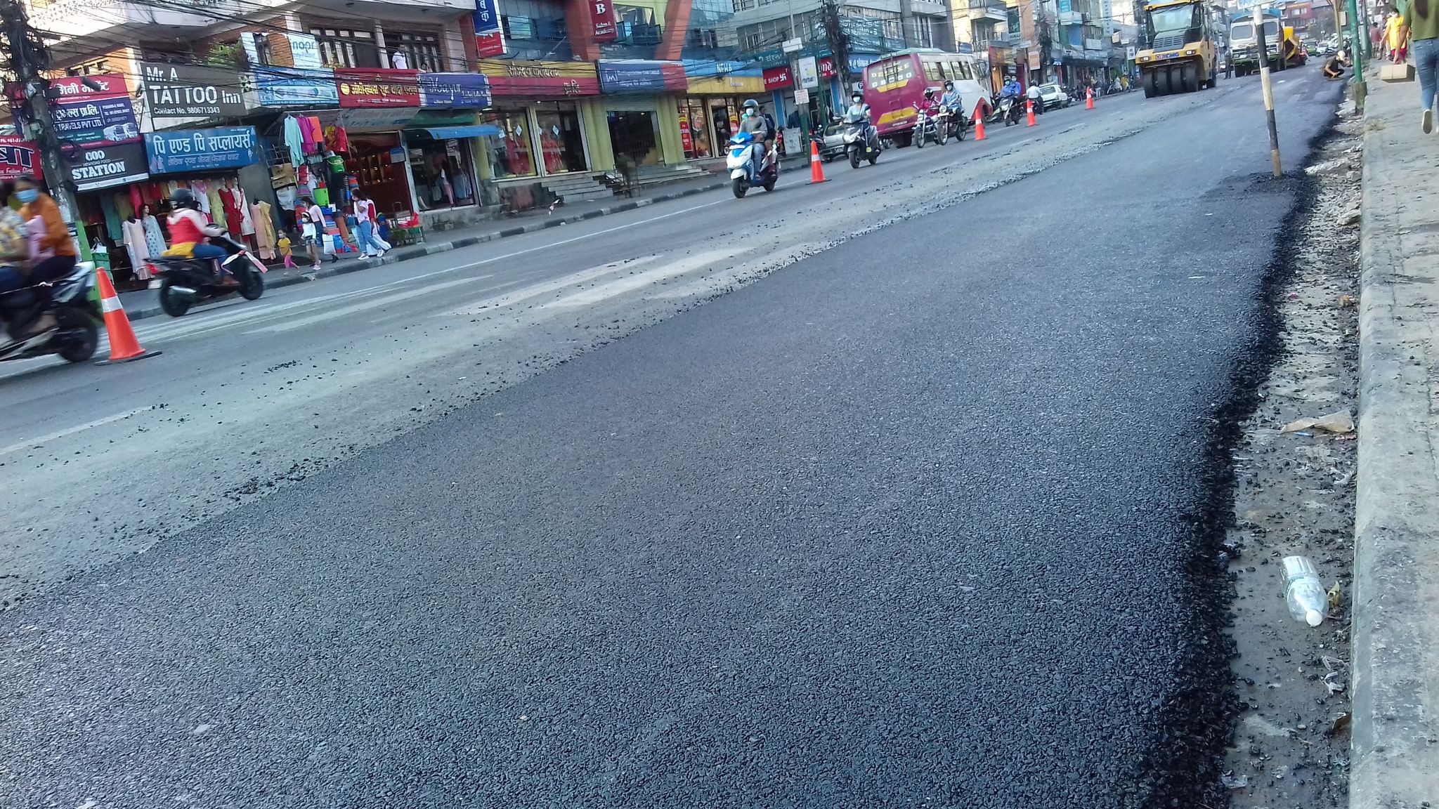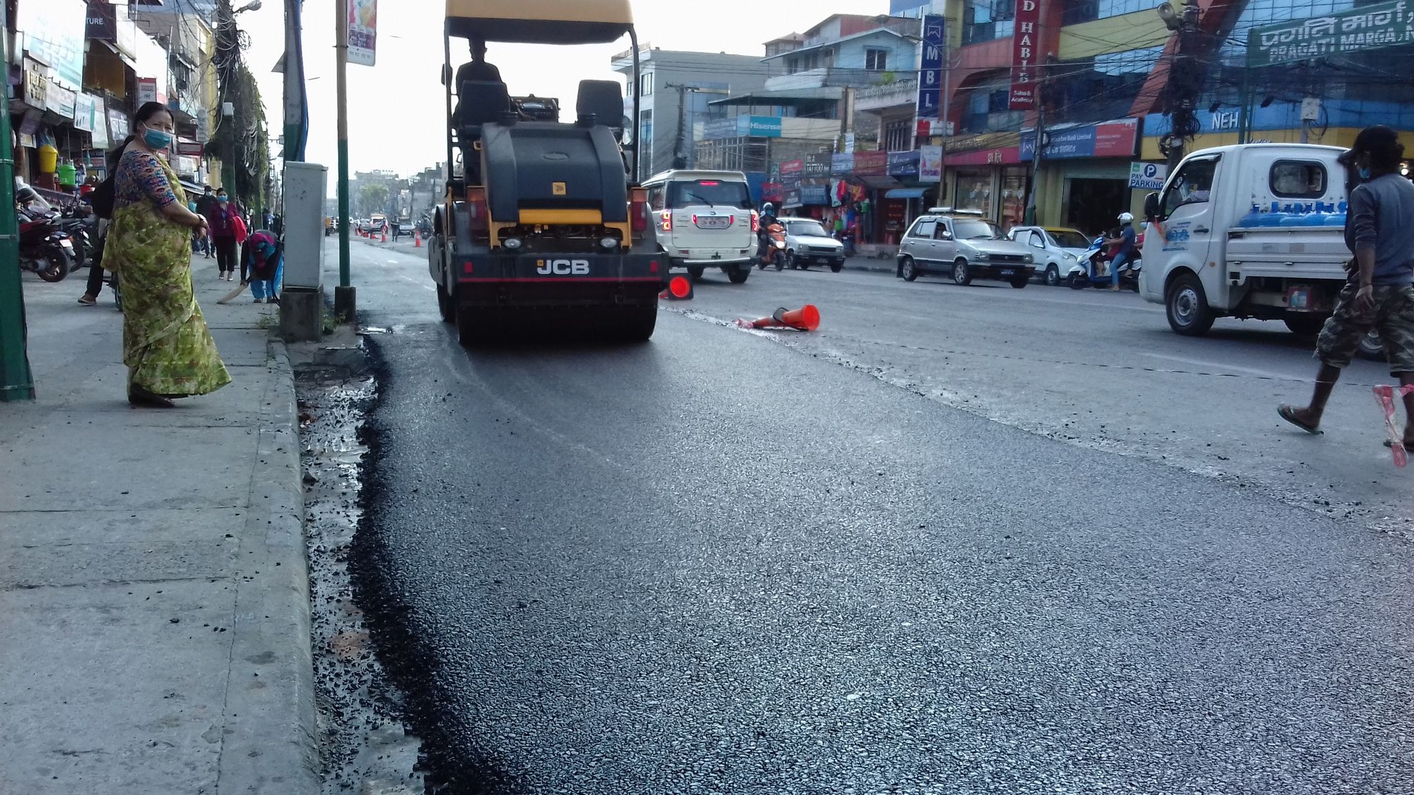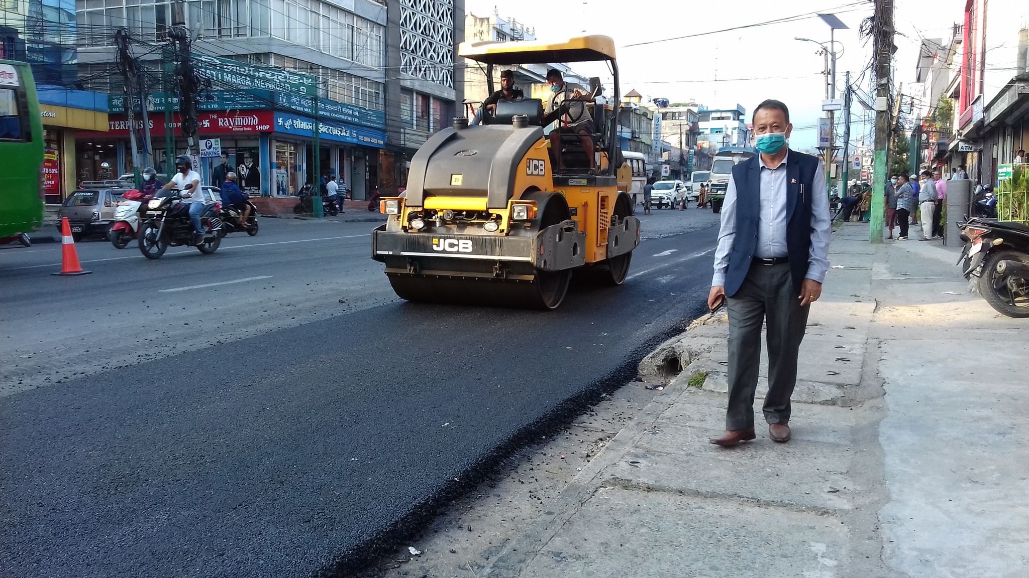 अहिले भइरहेको सडकमा एक तह थपिन्छ । तर, चौडाइ उही नै हो,’ महानगरपालिकाका इन्जिनियर राजु रेग्मीले भन्नुभयो ।बढी गाडीको चाप हुने ठाउँमा टिकाउ सडकका लागि अस्फाल्ट प्रविधिबाट सडक बनाउन लागिएको हो उहाँले भन्नुभयो । तस्विर ः एकराज गिरी