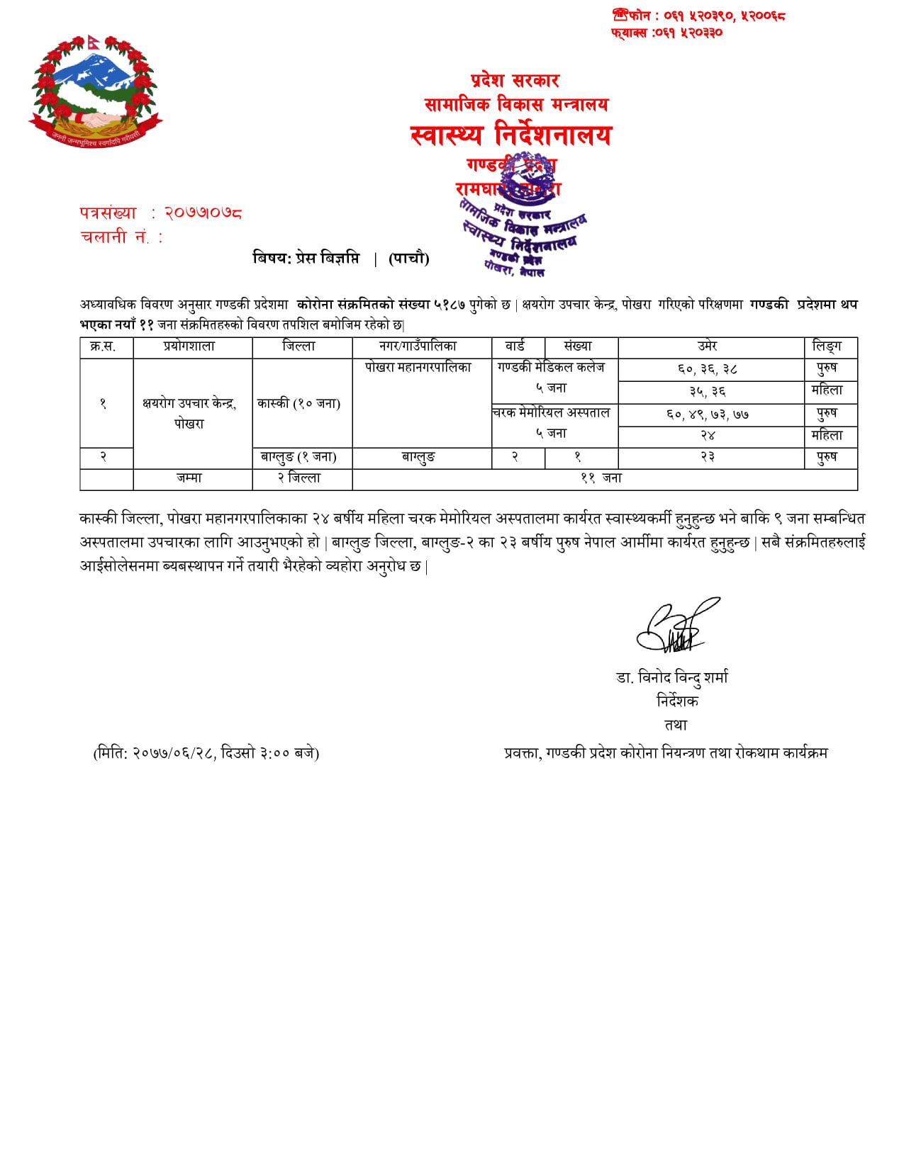 स्वास्थ्यकर्मी सहित नयाँ संक्रमित पुष्टि भएको हो । पोखरा महानगरपालिकाका २४ बर्षीय महिला चरक मेमोरियल अस्पतालमा कार्यरत स्वास्थ्यकर्मी हुनुहुन्छ भने बाँकी ९ जना सम्बन्धित अस्पतालमा उपचारका लागि आउनुभएको निर्देशनालयले जनाएको छ ।