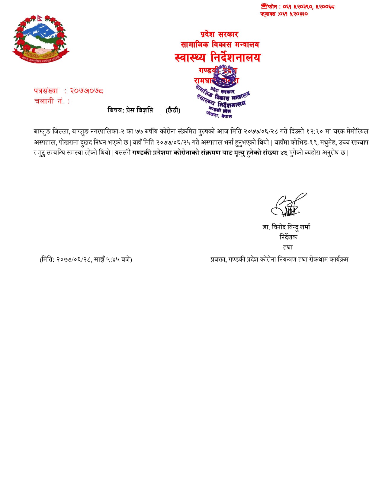 मृतक असोज २५ गते अस्पताल भर्ना हुनुभएको थियो । वहाँलाई कोभिड १९, मधुमेह, उच्च रक्तचाप र मुटु सम्बन्धि समस्या रहेको थियो बताइएको छ । यससंगै गण्डकी प्रदेशमा कोरोनाको संक्रमण बाट मृत्यु हुनेको संख्या ४६ पुगेको छ ।