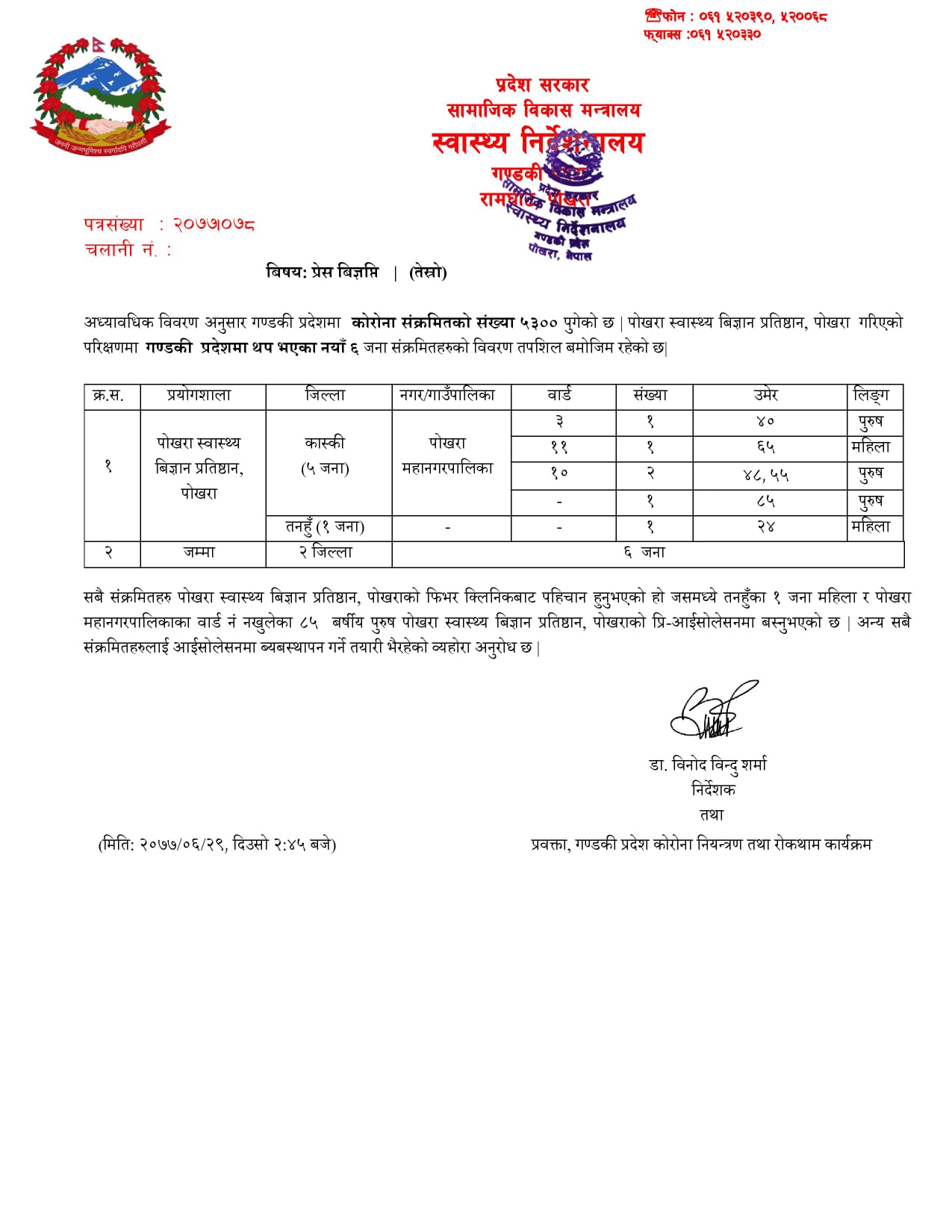 जसमध्ये तनहुँका १ जना महिला र पोखरा महानगरपालिकाका वडा नखुलेका ८५ बर्षीय पुरुष रहनु भएको छ । उहाँ पोखराको प्रिआईसोलेसनमा बस्नुभएको छ भने अन्य सबै संक्रमितहरुलाई आईसोलेसनमा ब्यबस्थापन गर्ने तयारी भैरहेको निर्देशनालयले जनाएको छ । गण्डकी प्रदेशमा अहिले सम्म कोरोना संक्रमितको संख्या ५३०० पुगेको छ ।