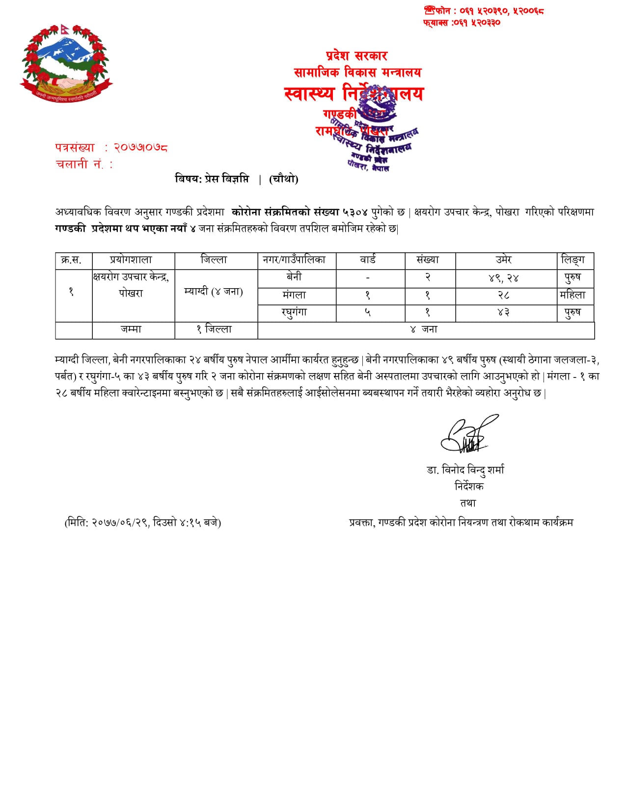 पोखरा, असोज २९ गते । गण्डकी प्रदेशमा थप नयाँ चार जना संक्रमितहरु थपिएका छन् । स्वास्थ्य निर्देशनालय गण्डकी प्रदेशले जारी गरेको विज्ञप्तिमा याग्दी जिल्ला, बेनी नगरपालिकाका २४ बर्षीय पुरुष र उहाँ नेपाल आर्मीमा कार्यरत हुनुहुन्छ । त्यस्तै बेनी नगरपालिकाका ४९ बर्षीय पुरुष र उहाँको स्थायी ठेगाना जलजला ३, पर्बत रहेको छ ।