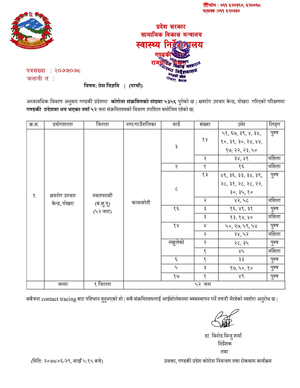 पोखरा, असोज २९ गते । गण्डकी प्रदेशमा फेरी ५२ जनामा कोरोना संक्रमण पुष्टि भएको छ । क्षयरोग उपचार केन्द्र, पोखरामा गरिएको परिक्षणमा गण्डकी प्रदेशमा थप नयाँ ५२ जनामा संक्रमण पुष्टि भएको हो ।
