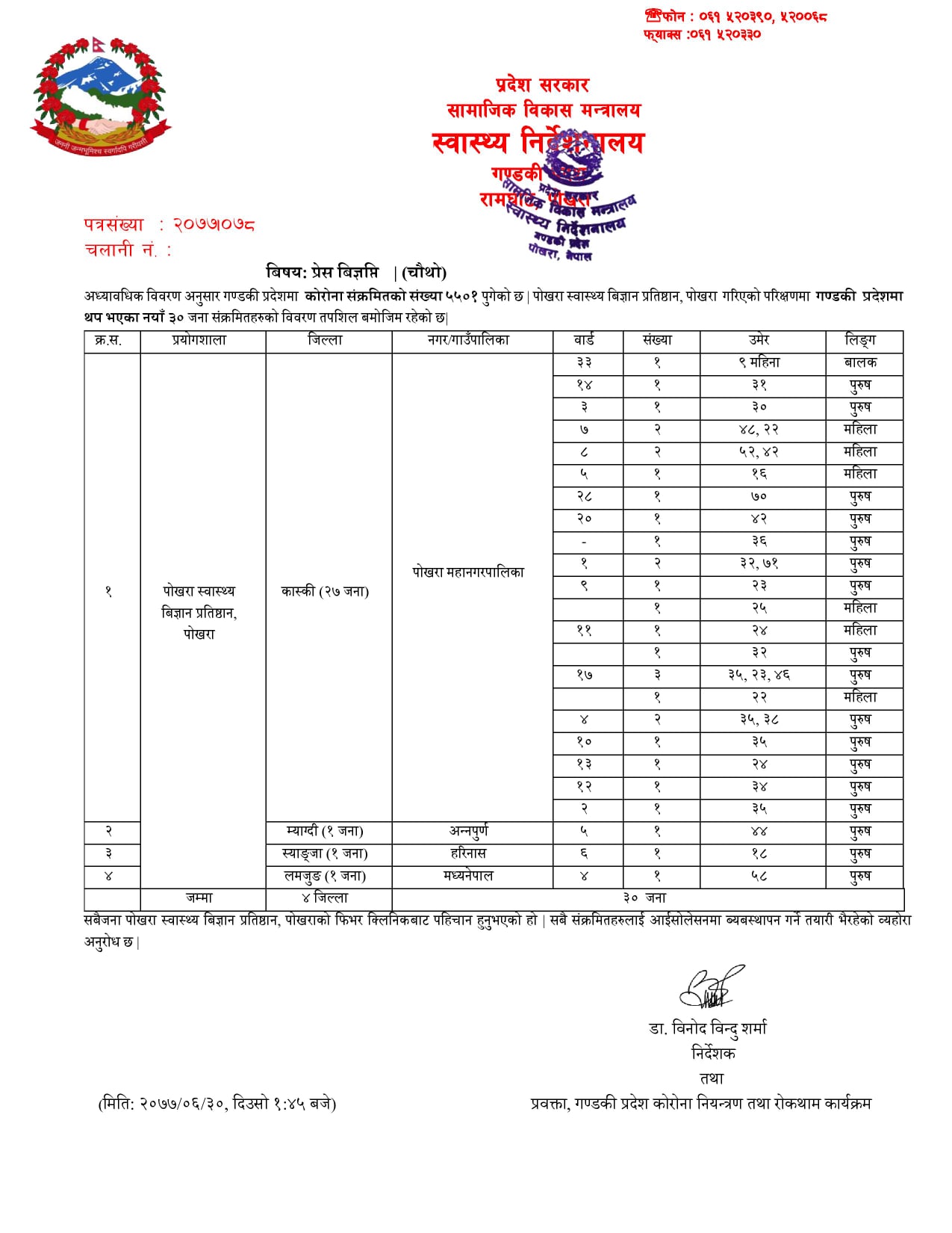 पोखरा, असोज ३० गते । गण्डकी प्रदेशमा फेरी नयाँ ३० जनामा कोरोना संक्रमण पुष्टि भएको छ । पोखरा स्वास्थ्य बिज्ञान प्रतिष्ठानमा गरिएको परिक्षणमा गण्डकी प्रदेशमा थप ३० जनामा संक्रमण पुष्टि भएको स्वास्थ्य निर्देशनालय पोखराले जनाएको छ ।