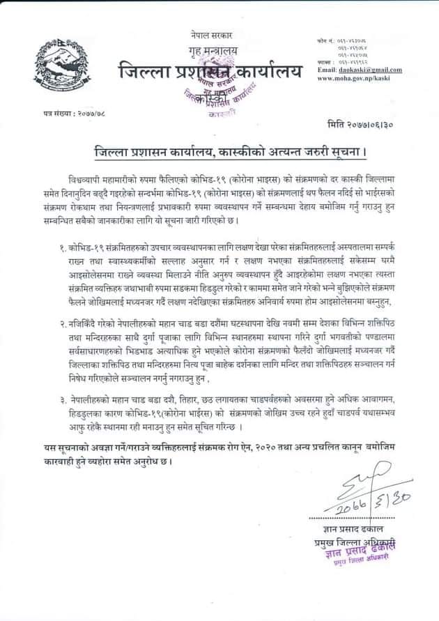 पोखरा, कात्तिक १ गते । कास्की जिल्लाभित्रका कुनैपनि शक्तिपीठ एंव मठमन्दिर सञ्चालनमा जिल्ला प्रशासन कार्यालय कास्कीले निषेध गरेको छ । जिल्ला प्रशासन कार्यालय कास्कीले शुक्रबार साँझ सार्वजनीक सुचना जारी गदै नृत्य पुजा बाहेक दर्शनका लागि मठमन्दिर सञ्चालन नगर्न नगराउन अनुरोध गरेकोछ ।