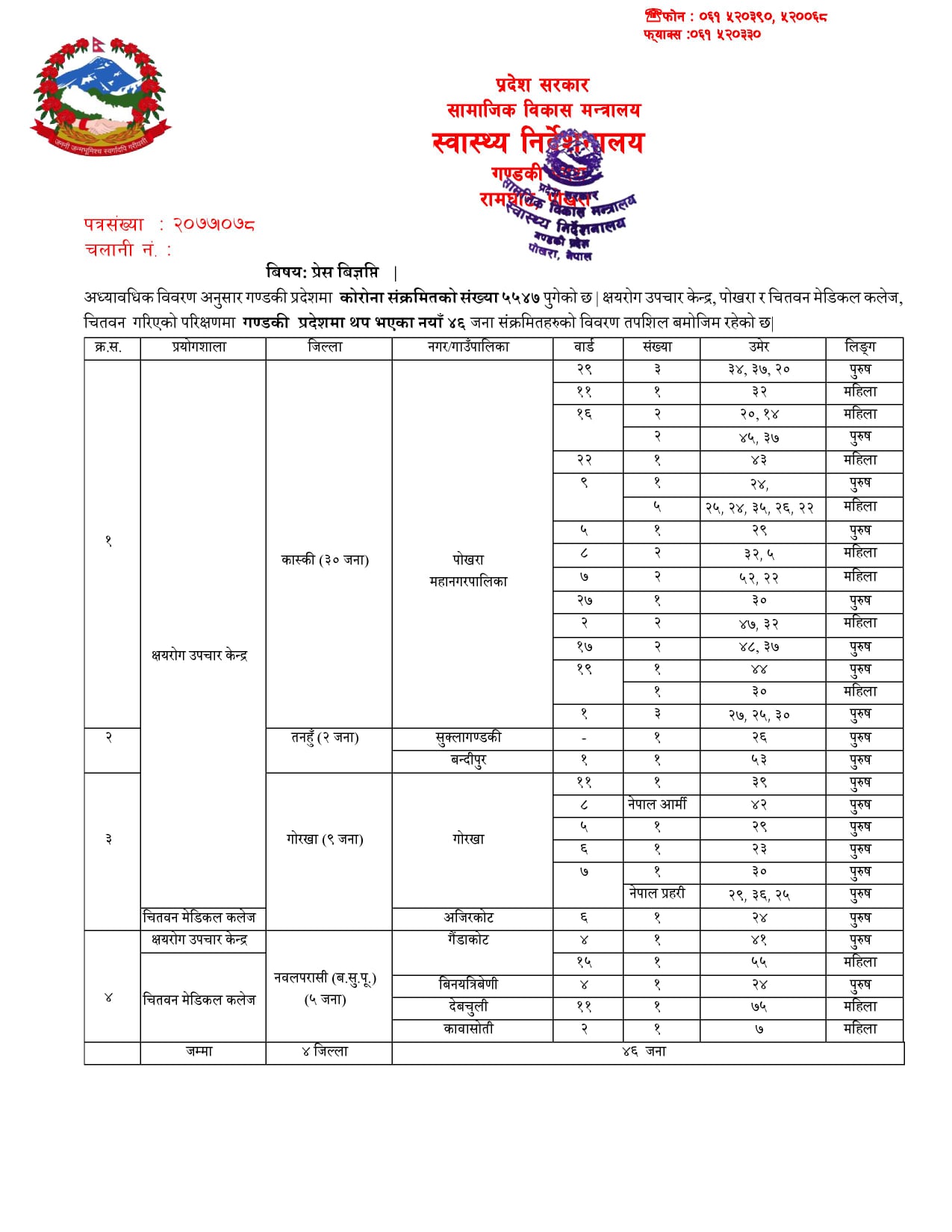 संख्या ५५४७ पुगेको छ ्र क्षयरोग उपचार केन्द्र, पोखरा गरिएको परिक्षणमा गण्डकी प्रदेशमा थप भएका नयाँ ४६ जना संक्रमितहरुको विवरण तपशिल बमोजिम रहेको छ् /