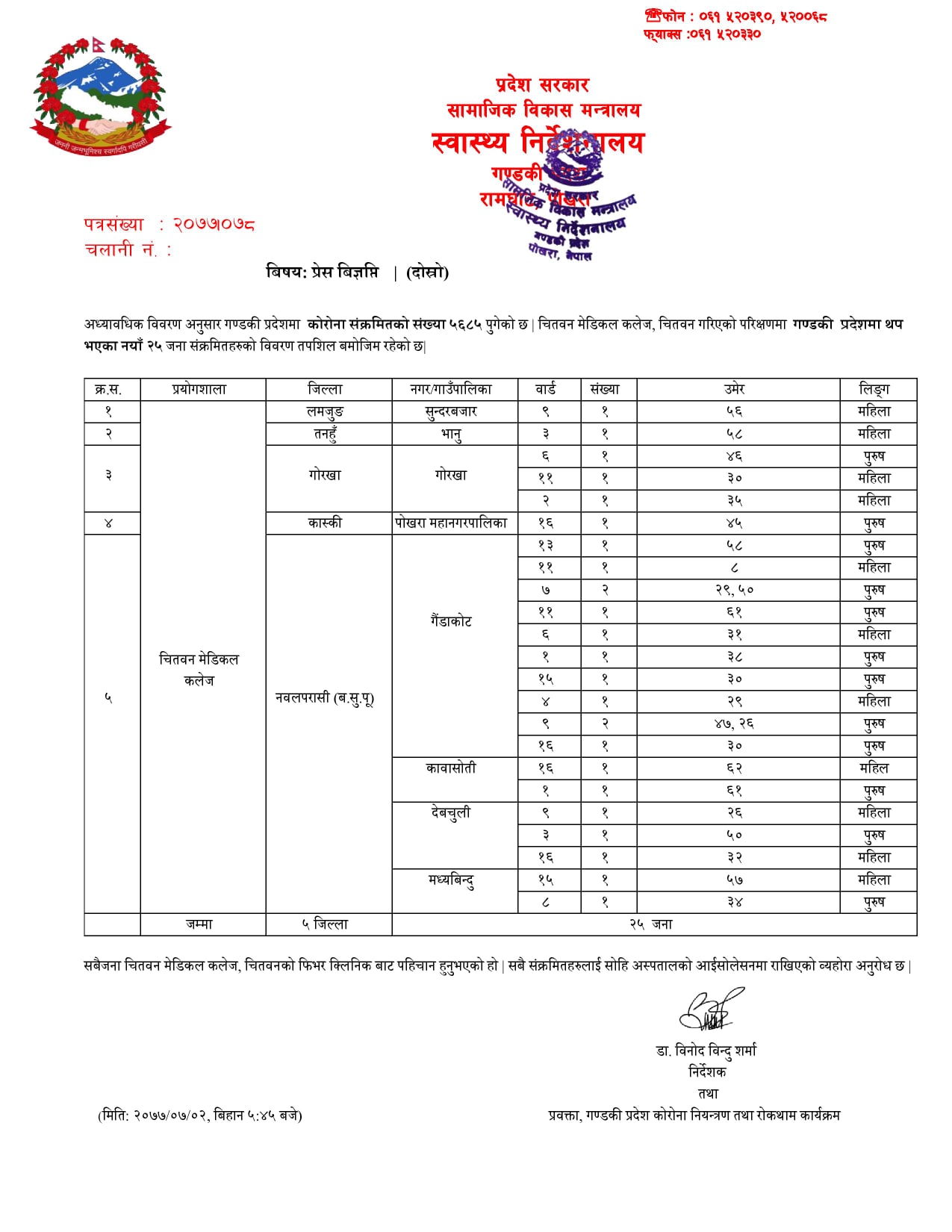 थपिनेमा चितवन मेडिकल कलेज गरिएको परिक्षणमा गण्डकी प्रदेशमा थप भएका नयाँ २५ जना संक्रमितहरु थपिएका हुन् । सबैजना चितवन मेडिकल कलेज, चितवनको फिभर क्लिनि बाट पहिचान हुनुभएको हो । सबै संक्रमितहरुलाई सोहि अस्पतालको आईसोलेसनमा राखिएको छ ।