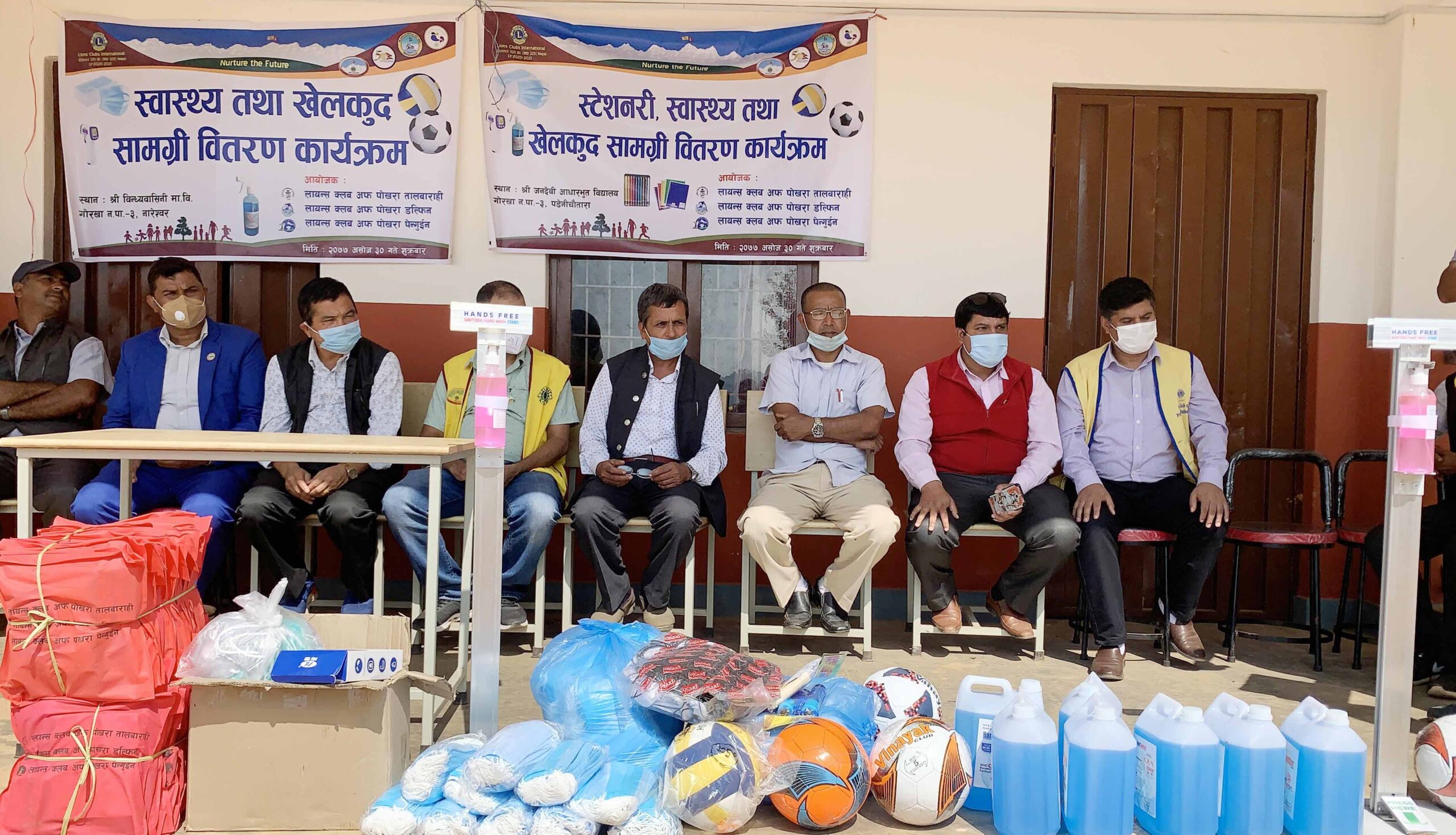 विशेषत बिद्यालयमा पठनपाठनका लागि आउने विद्यार्थीहरुका लागी कोभिडबाट बच्न प्रयोग गरिने स्वास्थ्य सामाग्री थर्मलगन, सेनिटाईजर, माक्स र खेलकुदका सामाग्रीहरु विन्दवासिनी मावि र जनदेबी आधारभूत विद्यालयका लागि सेनिटाईजर, माक्स, स्टेशनरी वितरण गरिएको तिवारीले बताउनुभयो । स्वास्थ्य, शिक्षा र वातावरणको क्षेत्रमा लायन्सले काम गरिरहेको बताउँदै शिक्षाको लागी आफूहरुले पोखरा बाहिर गोरखा सम्म आएको बताउनुभयो ।