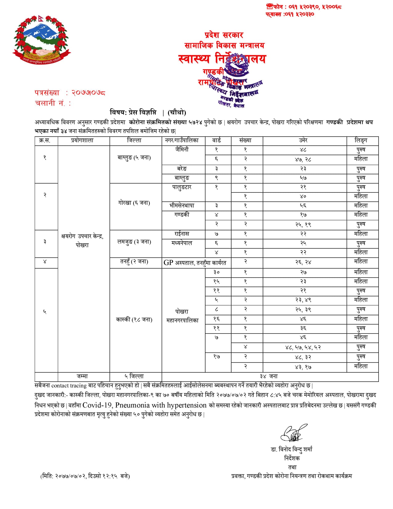 पोखरा, कात्तिक २ गते । गण्डकी प्रदेशमा नयाँ ३४ जनामा कोरोना संक्रमण पुष्टि भएको छ । क्षयरोग उपचार केन्द्र, पोखरामा गरिएको परिक्षणमा गण्डकी प्रदेशमा थप भएका नयाँ ३४ जना संक्रमितहरु थपिएको गण्डकी प्रदेश स्वास्थ्य निर्देशनालयले जनाएको छ ।