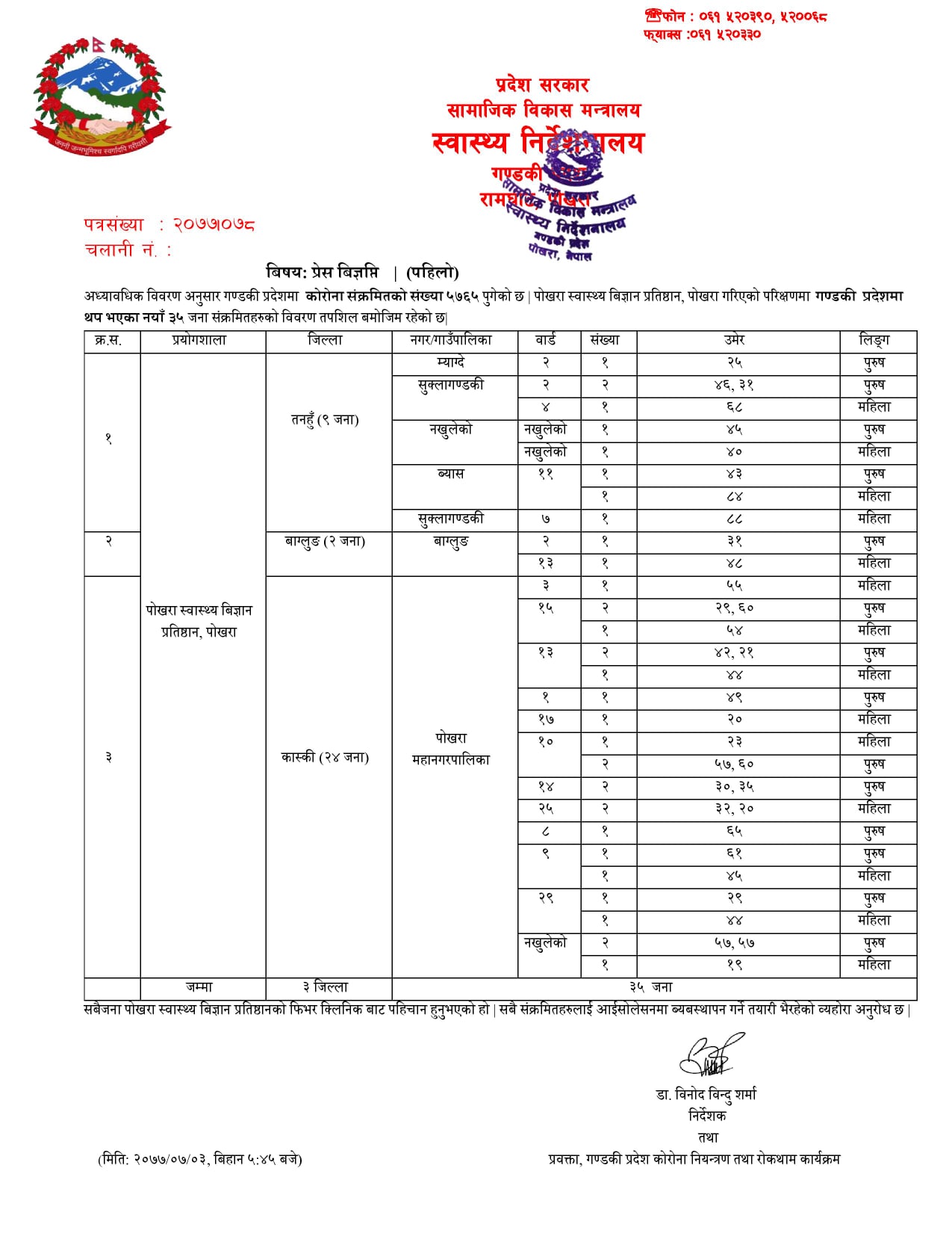 पोखरा, कात्तिक ३ गते । गण्डकी प्रदेशमा सोमबार बिहानै ५६ जनामा कोरोना संक्रण पुष्टि भएको छ । गण्डकी प्रदेश स्वस्थ्य निर्देशनालयले विहानै विज्ञप्ति जारी गदै नयाँ ५६ सक्रमित पुष्टि भएको जनाएको छ ।