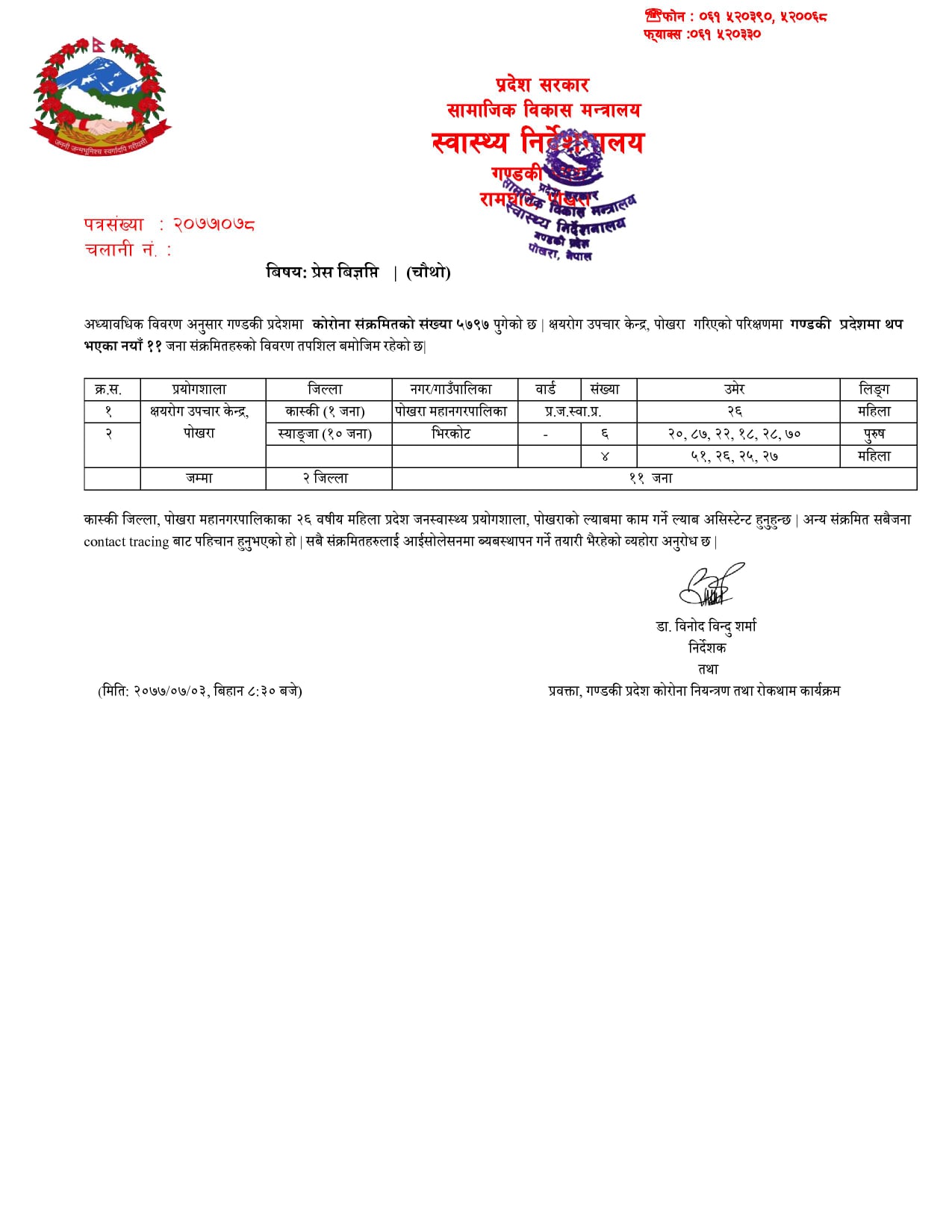 पोखरा महानगरपालिकाका २६ वषीय महिला प्रदेश जनस्वास्थ्य प्रयोगशालाको ल्याबमा काम गर्ने ल्याब असिस्टेन्ट हुनुहुन्छ । अन्य संक्रमित सबैजना कन्ट्याकटेसिगबाट पहिचान हुनुभएको हो ।