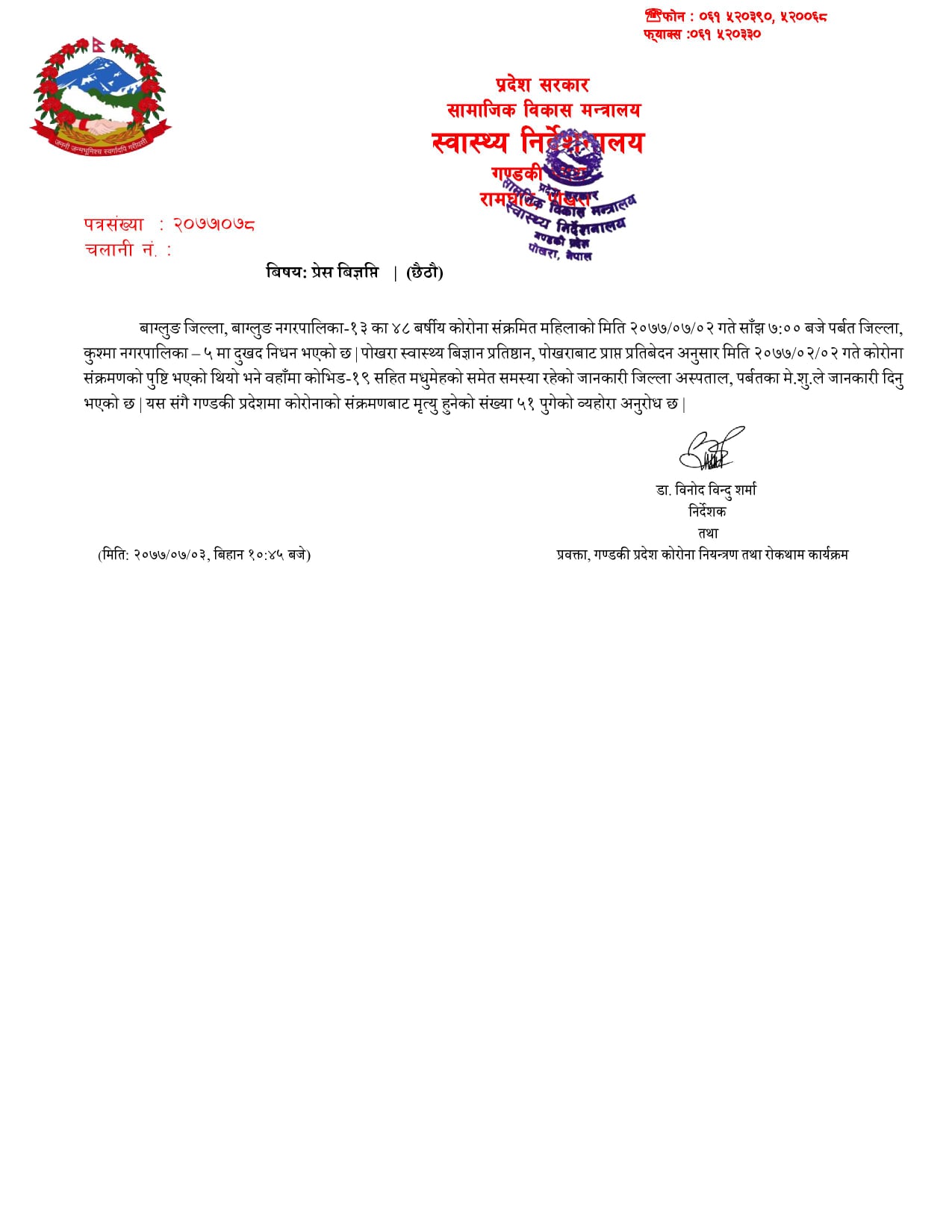 बाग्लुङ नगरपालिका १३ की ४८ बर्षीय कोरोना संक्रमित महिलाको आइतबार साँझ ७ बजे पर्बत जिल्ला, कुश्मा नगरपालिका – ५ मा निधन भएको स्वास्थ्य निर्देशनालय गण्डकी प्रदेशले जनाएको छ । पोखरा स्वास्थ्य बिज्ञान प्रतिष्ठान पोखराबाट प्राप्त प्रतिबेदन जेठ २ गते कोरोना संक्रमणको पुष्टि भएको थियो । उहाँ कोभिड १९ सहित मधुमेहको समेत समस्या रहेको जिल्ला अस्पताल पर्बतका मेशुले जानकारी दिएको निर्देशनालयले जनाएको छ । गण्डकी प्रदेशमा कोरोनाको संक्रमणबाट मृत्यु हुनेको संख्या ५१ पुगेको छ ।