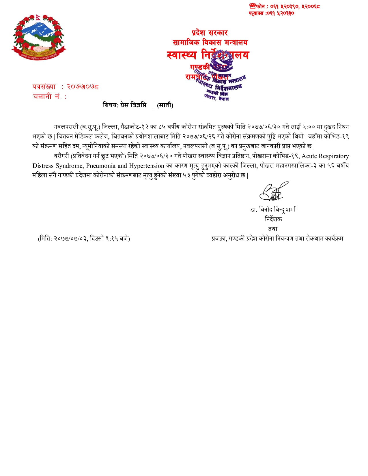 चितवन मेडिकल कलेज, चितवनको प्रयोगशालाबाट २६ गते कोरोना संक्रमण पुष्टि भएको थियो । उहाँमा कोभिड १९ संक्रमण सहित दम, न्यूमोनियाको समस्या रहेको स्वास्थ्य कार्यालय, नवलपरासीका प्रमुखबाट जानकारी प्राप्त भएको निर्देशनालयले जनाएको छ । यसैगरी प्रतिबेदन गर्न छुट भएको भन्दै असोज ३० गते पोखरा स्वास्थ्य बिज्ञान प्रतिष्ठान, पोखरामा कोभिड(१९,का कारण मृत्यु हुनुभएको पोखरा महानगरपालिका ३ का ५६ बर्षीय महिलासंगै गण्डकी प्रदेशमा कोरोनाको संक्रमणबाट मृत्यु हुनेको संख्या ५३ पुगेको व्यहोरा अनुरोध छ