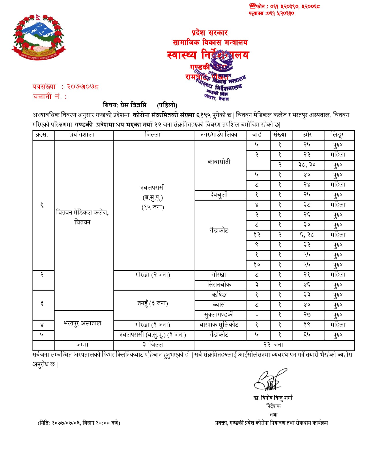 पोखरा, कात्तिक ६ गते ।गण्डकी पदेशमा बिहिबार २२ जनामा कोरोना संक्रमण पुष्टि भएको छ । चितवन मेडिकल कलेज र भरतपुर अस्पतालमा चितवन गरिएको परिक्षणमा गण्डकी प्रदेशमा थप नयाँ २२ जना संक्रमितहरु थपिएका हुन् ।