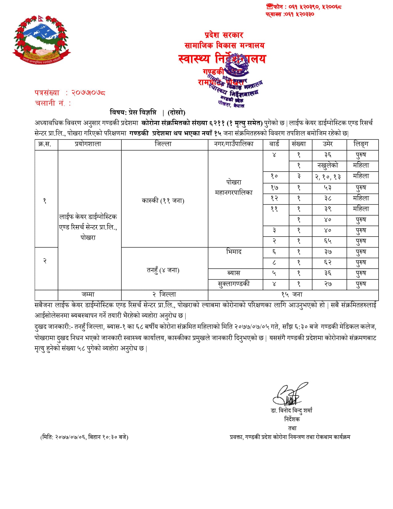 पोखरा, कात्तिक ६ गते । गण्डकी प्रदेशमा नयाँ १५ जनामा कोरोना संक्रमण पुष्टि भएको छ ।लाईफ केयर डाईग्नोस्टिक एण्ड रिसर्च सेन्टर प्रा.लि. पोखरामा गरिएको परिक्षणमा गण्डकी प्रदेशमा थप नयाँ १५ जना संक्रमित थपिएका हुन् ।