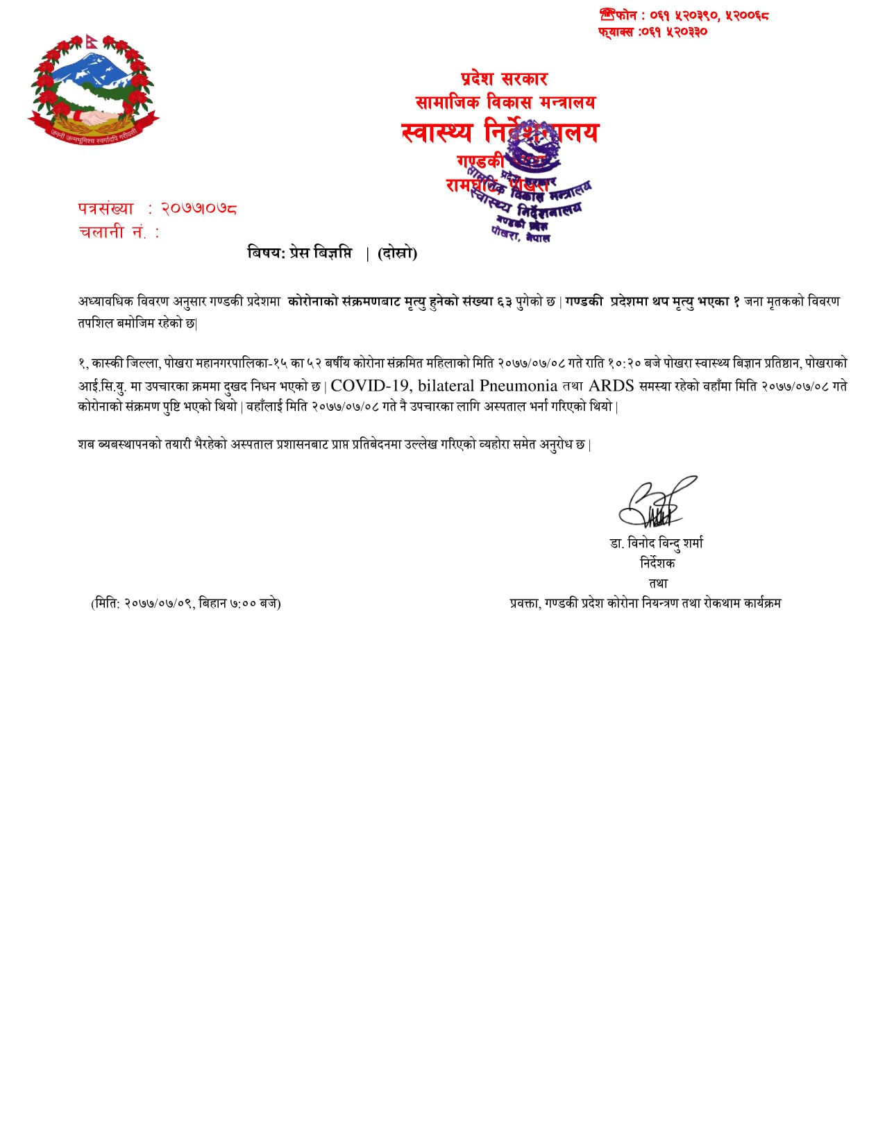 मृतकलार्य ८ गते कोरोनाको संक्रमण पुष्टि भएको थियो । उहाँलाई ८ गते नै उपचारका लागि अस्पताल भर्ना गरिएको थियो । शब ब्यबस्थापनको तयारी भैरहेको अस्पताल प्रशासनबाट प्राप्त प्रतिबेदनमा उल्लेख गरिएको छ । गण्डकी प्रदेशमा मृत्यु हुनेको संख्या ६३ पुगेको छ ।