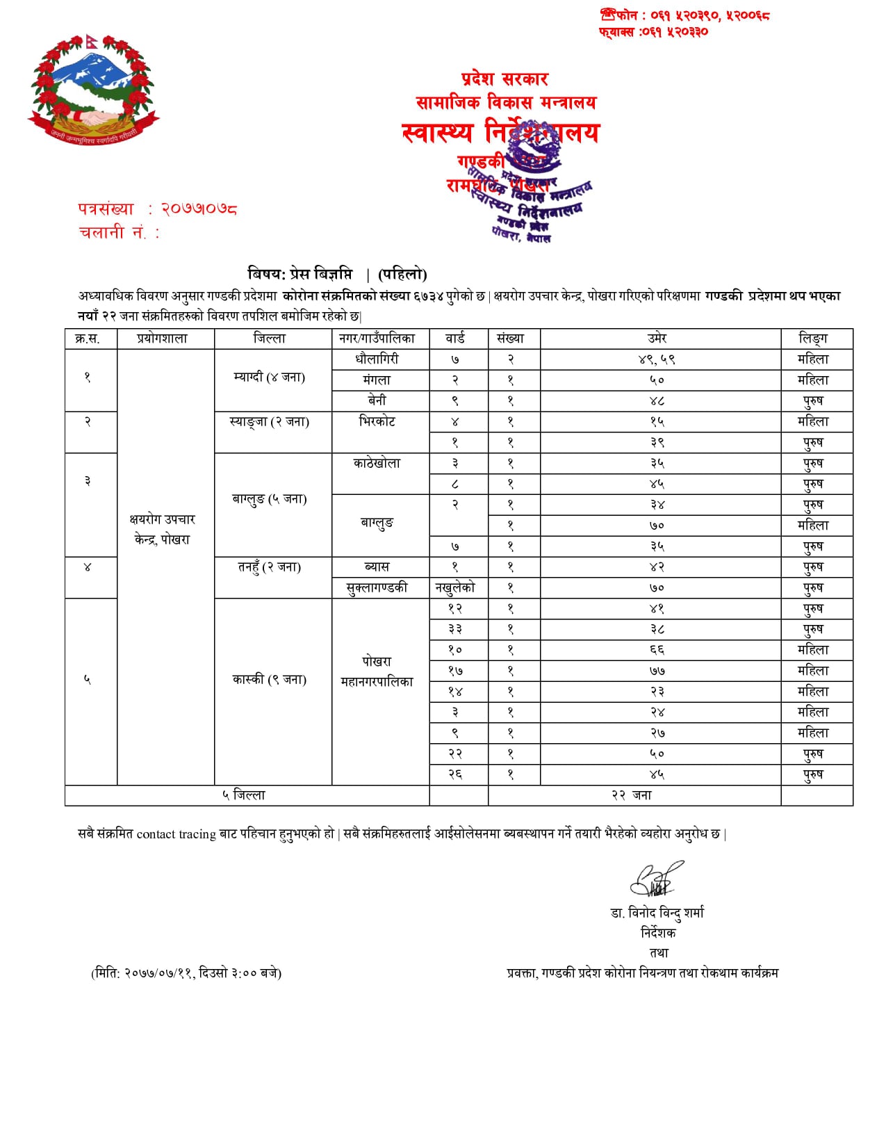 पोखरा, कात्तिक ११ गते । गण्डकी प्रदेशमा ७८ संक्रमित थपिएका छन । लाईफ केयर डाईग्नोस्टिक एण्ड रिसर्च प्रालि. र क्षयरोग उपचार केन्द्र, पोखरामा गरिएको परिक्षणमा गण्डकी प्रदेशमा नयाँ ५६ जना संक्रमित थपिएका हुन् ।गण्डकीमा कोरोना संक्रमितको संख्या ६७९० पुगेको छ ।