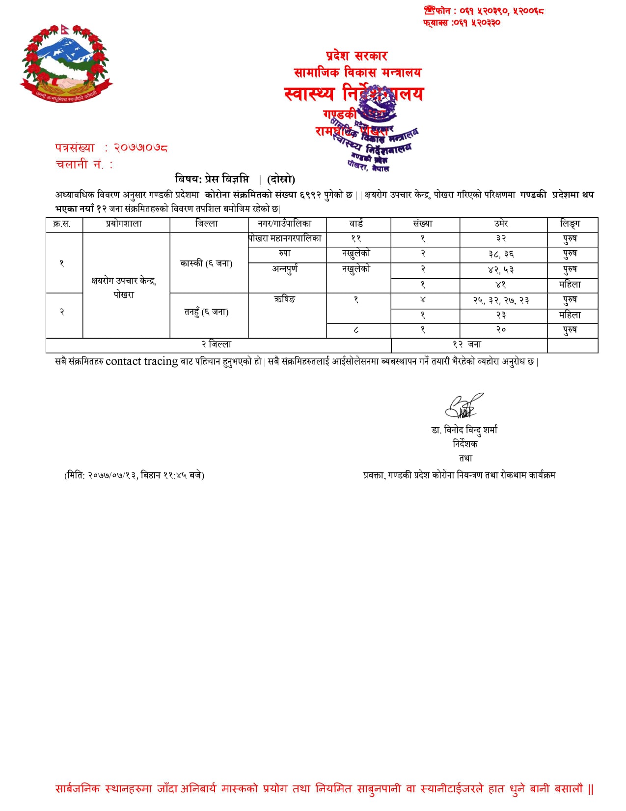 पोखरा, कात्तिक १३ गते । गण्डकी प्रदेशमा नयाँ १२ जना संक्रमितहरु थपिएका छन् । क्षयरोग उपचार केन्द्र पोखरामा गरिएको परिक्षणमा गण्डकी प्रदेशमा १२ जना संक्रमित थपिएका हुन् ।