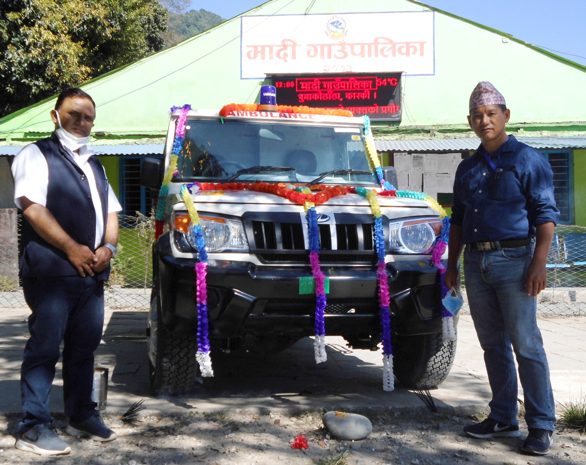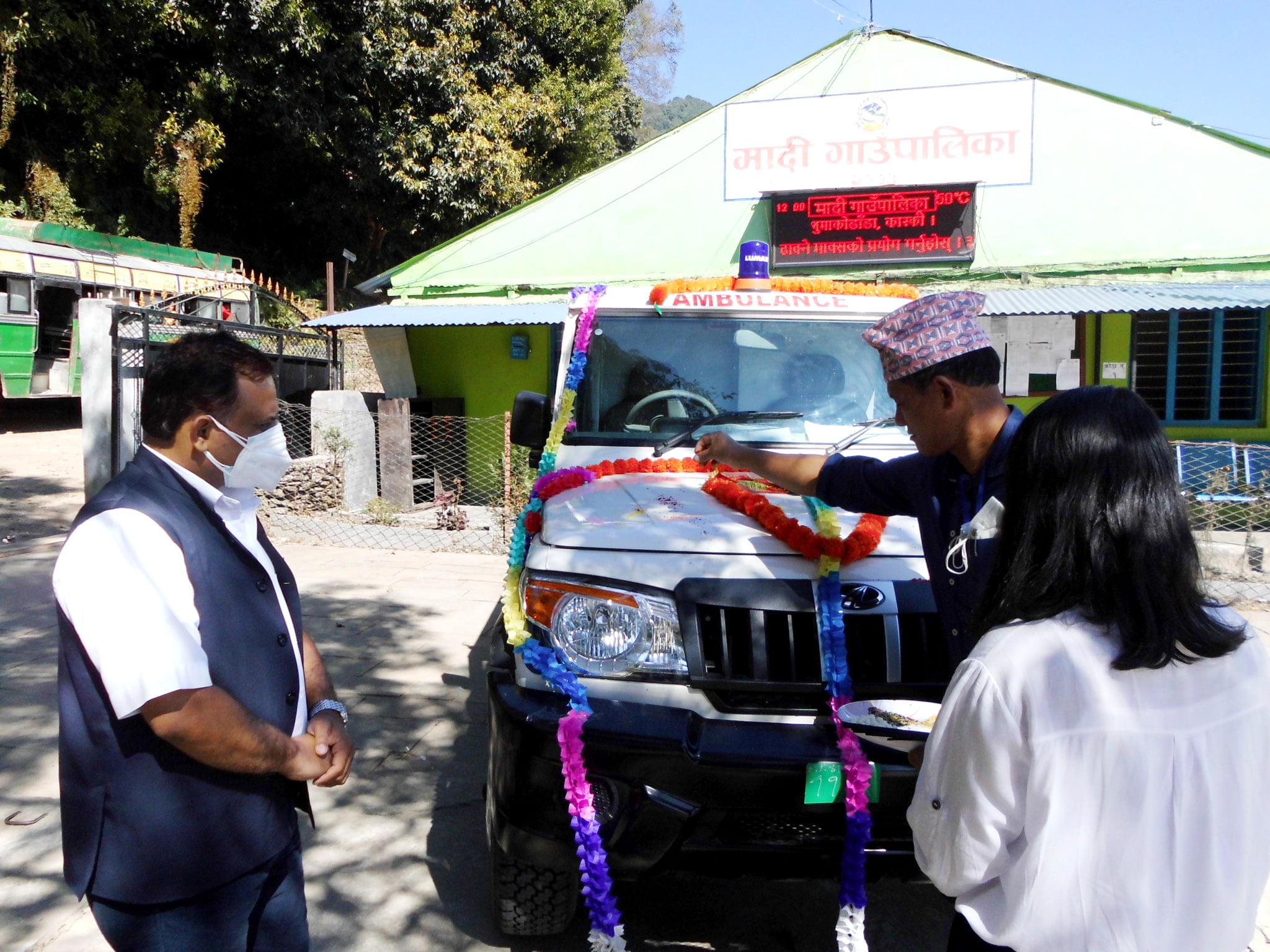 पोखरा, कात्तिक १३ गते । कास्कीको मादी गाँउपालिकाले आफनै एम्वुलेन्स सञ्चालन गरेको छ । गाँउपालिकाले बिहिबारबाट एम्बुलेन्स सञ्चालनमा ल्याएको हो ।
