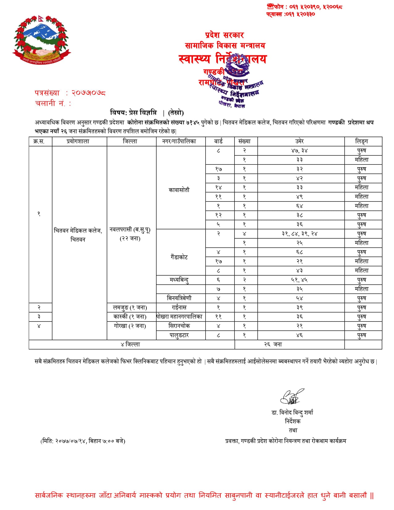 चितवन मेडिकल कलेज, चितवन गरिएको परिक्षणमा गण्डकी प्रदेशमा नयाँ २६ जना, लाईफ केयर डाईग्नोस्टिक प्रा.लि, पोखरामा गरिएको परिक्षणमा गण्डकी नयाँ ६५ जना संक्रमितहरु थप भएका हुन् ।