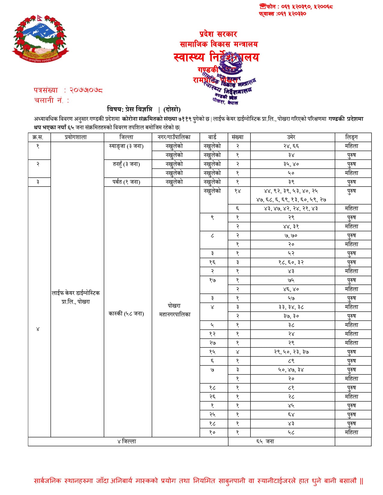 स्वस्थ्य निर्देशनालय गण्डकीले पोखरा महानगरपालिका, न्यूरोड स्थित लाईफ केयर डाईग्नोस्टिक प्रालि पोखराले कोरोनाको परिक्षण पश्चात प्रेषण गर्ने विवरणहरु पूर्ण रुपमा यस निर्देशनालयमा पठाउनुहुन अनुरोध गरेको छ । साथै सम्बन्धित स्थानीय पालिकाहरुसंगको सहकार्यमा संक्रमितहरुलाई आईसोलेसन ब्यबस्थापनमा समेत सहयोग गर्नुहुन अनुरोध छ ।