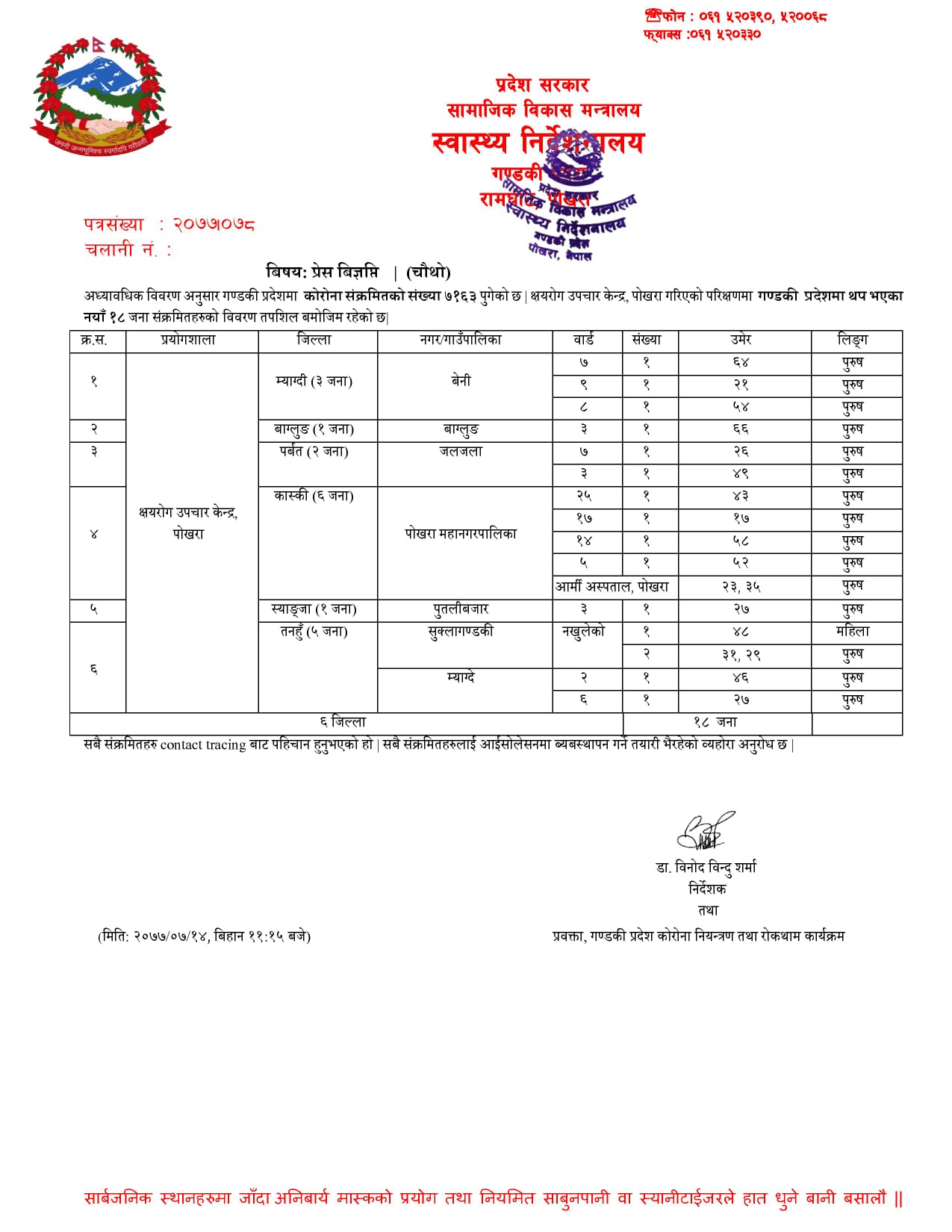सबै संक्रमितहरु कन्ट्याक्ट टेसिंङबाट पहिचान हुनुभएको हो । सबै संक्रमितहरुलाई आईसोलेसनमा ब्यबस्थापन गर्ने तयारी भैरहेको स्वास्थ्य निर्देशनालय गण्डकीले जनाएको छ ।
