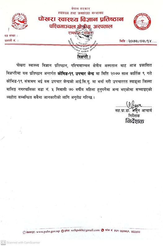 कोरोना संक्रमित महिलाको शुक्रबार बिहान ८ः३५ बजे पोखरा स्वास्थ्य बिज्ञान प्रतिष्ठानको आईसियुमा उपचारका क्रममा निधन भएको हो । उहाँमा कार्तिक ९ गते कोरोनाको संक्रमण पुष्टि भएको थियो ।