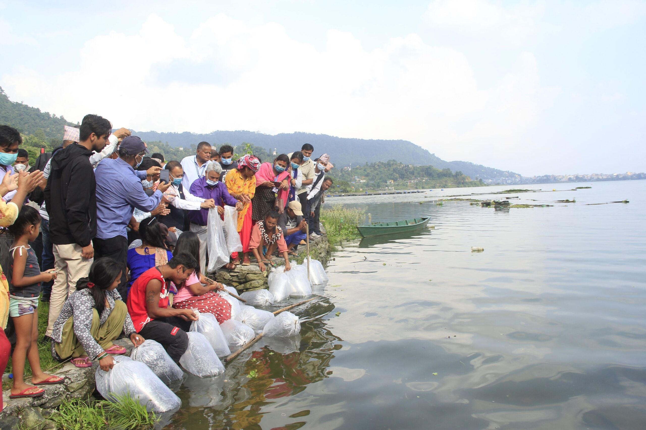 पोखरा, असोज १६ गते ।पोखराको फेवातालमा माछाका भुराहरु छाडीएको छ । विभिन्न प्रजातीका १५ हजार माछाका भुरा तालमा छाडिएको हो ।