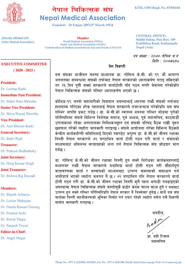 ‘७२ घण्टाभित्र पनि नेपाल सरकारले वार्ता टोली गठन गरी डा। केसीको जीवन रक्षाका निम्ती कुनै पहल अगाडि नबढाइएको अवस्थामा नेपाल चिकित्सक संघले जस्तोसुकै कठोर कदम चाल्न बाध्य हुने र यसबाट उत्पन्न हुन सक्ने गम्भिर परिस्थितिप्रति नेपाल सरकार नै जिम्मेवार हुनेछ’ संघका महासचिव बद्री रिजालले विज्ञप्तिमार्फत चेतावनी दिएका छन् ।