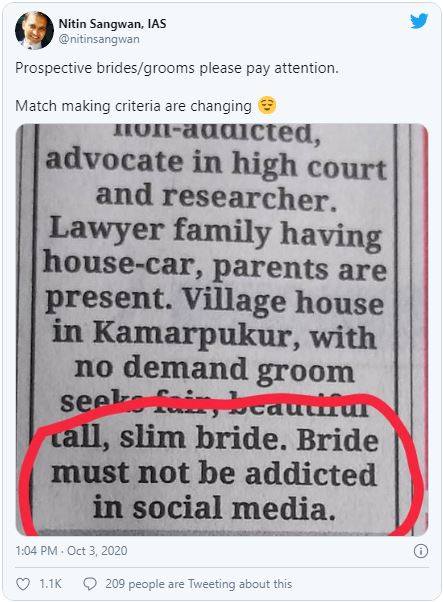 भारतका आईएएस नितिन सांगवानले ट्विटरमा आफ्नी जीवनसाथीको विवरणमा केटी सुन्दर, स्लिम र अग्ली हुनु पर्ने माग गरेका छन् । यस अलावा उनमा सामाजिक सञ्जालको लत नभएको हुनु पर्ने उल्लेख गरेका छन् ।