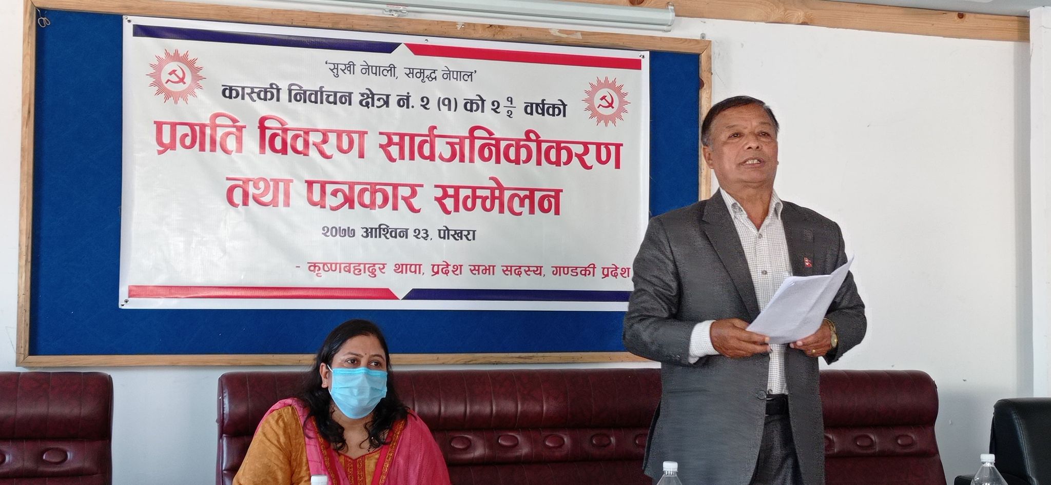 पोखरा, असोज २३ गते । गण्डकी प्रदेशसभा सदस्य एवं नेपाल कम्युनिष्ट पार्टी(नेकपा)कास्कीका अध्यक्ष कृष्णबहादुर थापाले आफ्नो साढे दुई वर्षको अवधिमा आफ्नोे निर्वाचन क्षेत्रमा भएका पूर्वाधार विकास गतिविधि सार्वजनीक गर्नुभएको छ ।