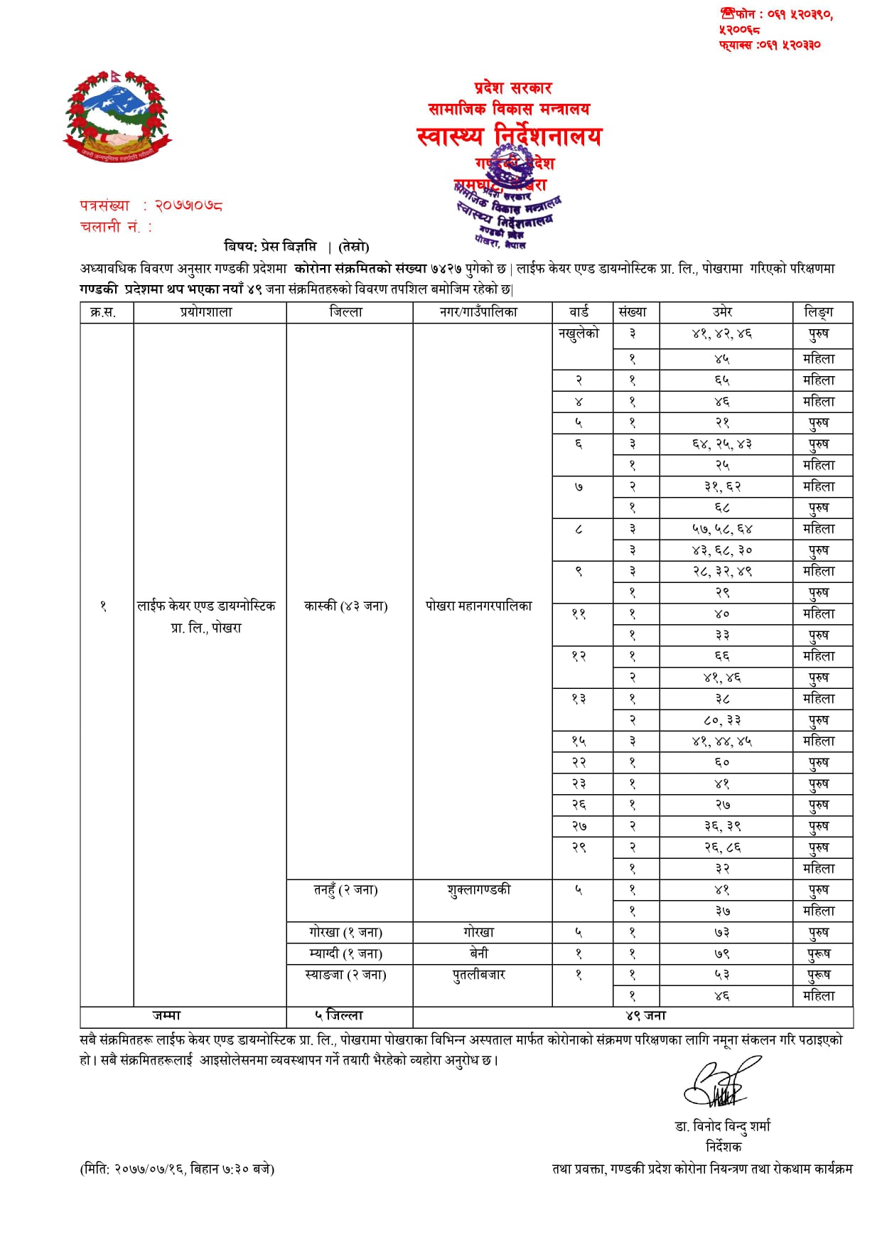 सबै संक्रमितहरू लाईफ केयर एण्ड डायग्नोस्टिक प्रा। लि।, पोखरामा पोखराका विभिन्न अस्पताल मार्फत कोरोनाको संक्रमण परिक्षणका लागि नमूना संकलन गरि पठाइएको थियो । सबै संक्रमितहरूलाई आइसोलेसनमा व्यवस्थापन गर्ने तयारी भैरहेको छ ।गण्डकी प्रदेशमा कोरोना संक्रमितको संख्या ७४२७ पुगेको छ ।