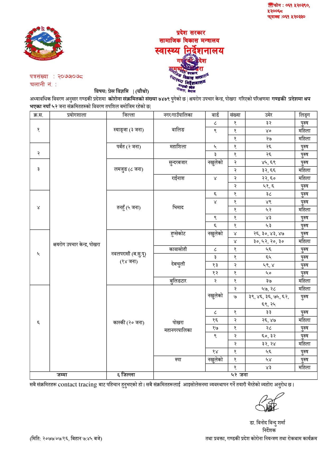 पोखरा, कात्तिक १६ गते । गण्डकी प्रदेशमा थप ५२ जनामा कोरोना संक्रमण पुष्टि भएको छ । क्षयरोग उपचार केन्द्र, पोखरा गरिएको परिक्षणमा गण्डकी प्रदेशमा नयाँ ५२ जना संक्रमितहरु पुष्टि भएका छन् ।