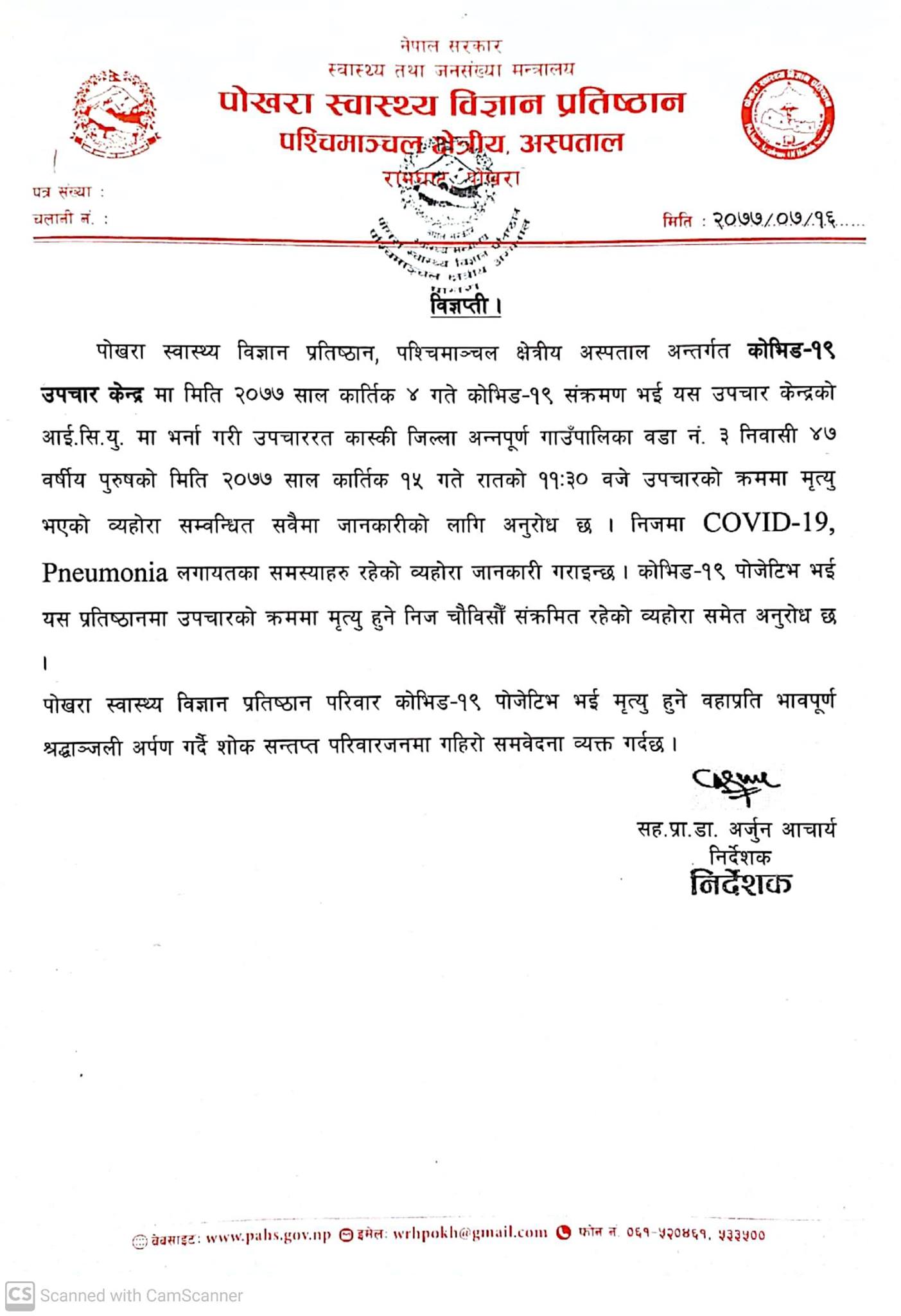 पोखरा स्वास्थ्य विज्ञान प्रतिष्ठान पश्चिमाञ्चल क्षेत्रीय अस्पताल अन्र्तगत कोभिड–१९ उपचार केन्द्रमा उपचारका क्रममा मृत्यु भएको हो ।