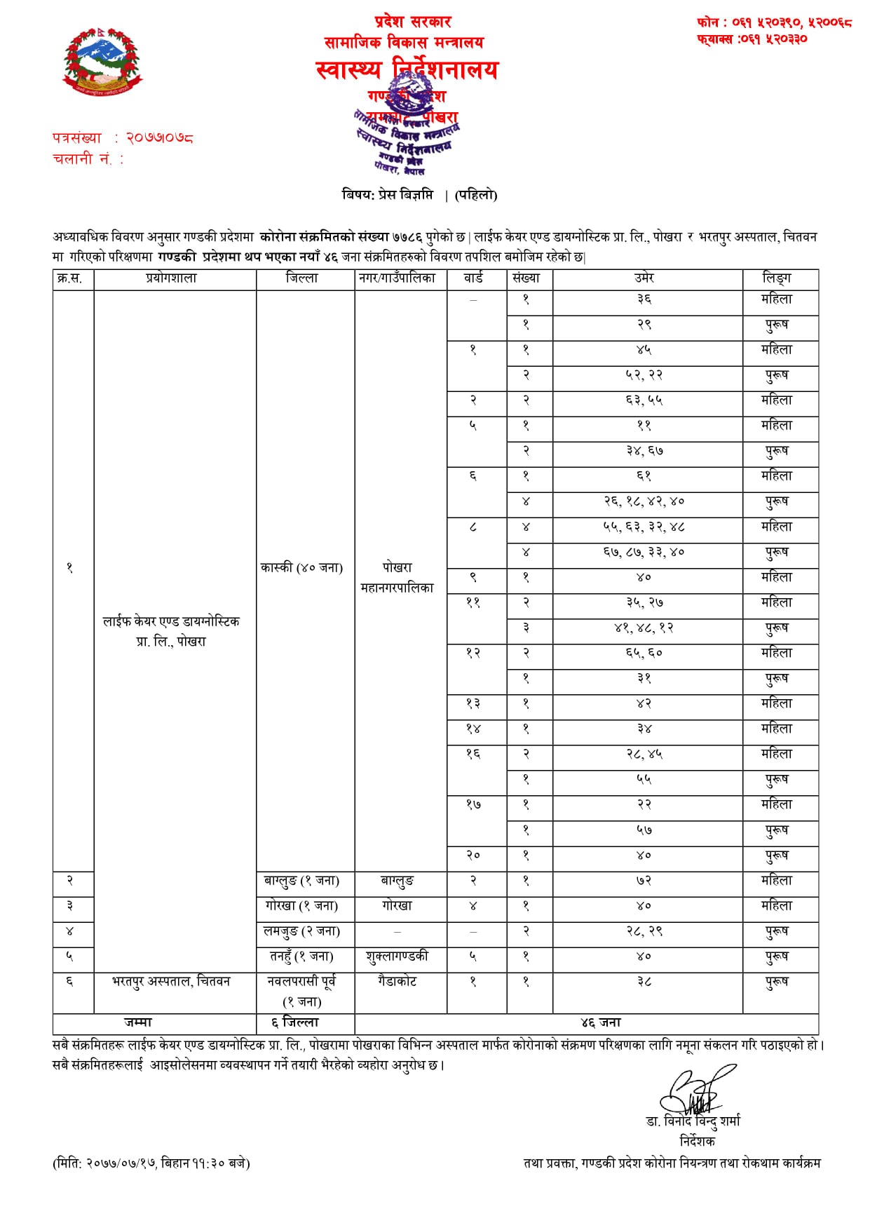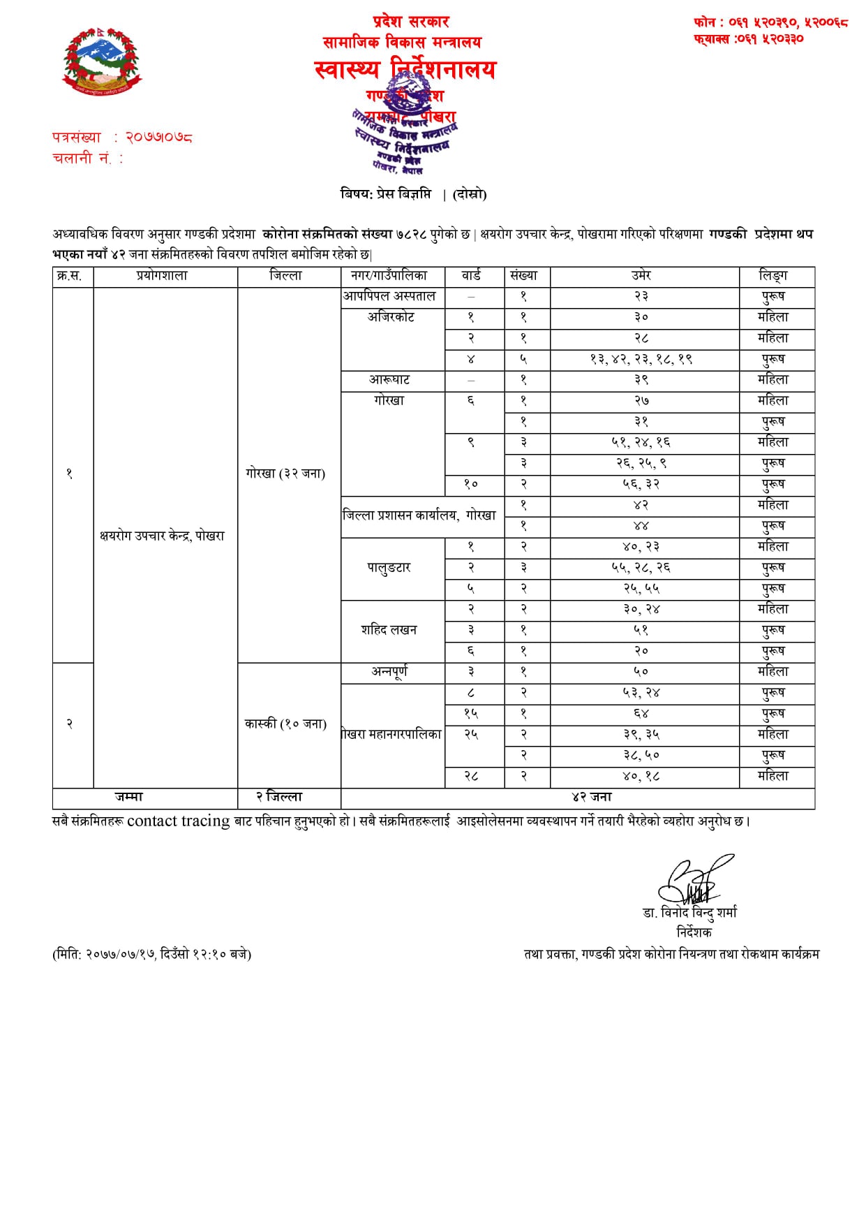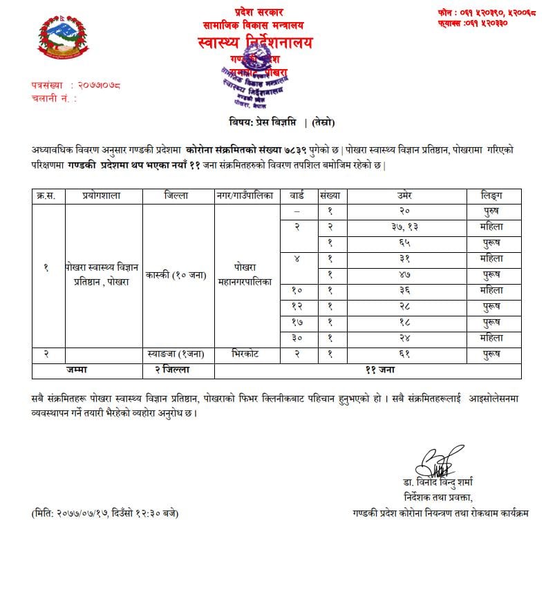 स्वास्थ्य निर्देशनालय गण्डकीले जारी आइतबार दिउसो जारी गरेका तीन विज्ञप्तिमा गण्डकीमा नयाँ ९९ संक्रमित थपिएको जनाएको छ ।