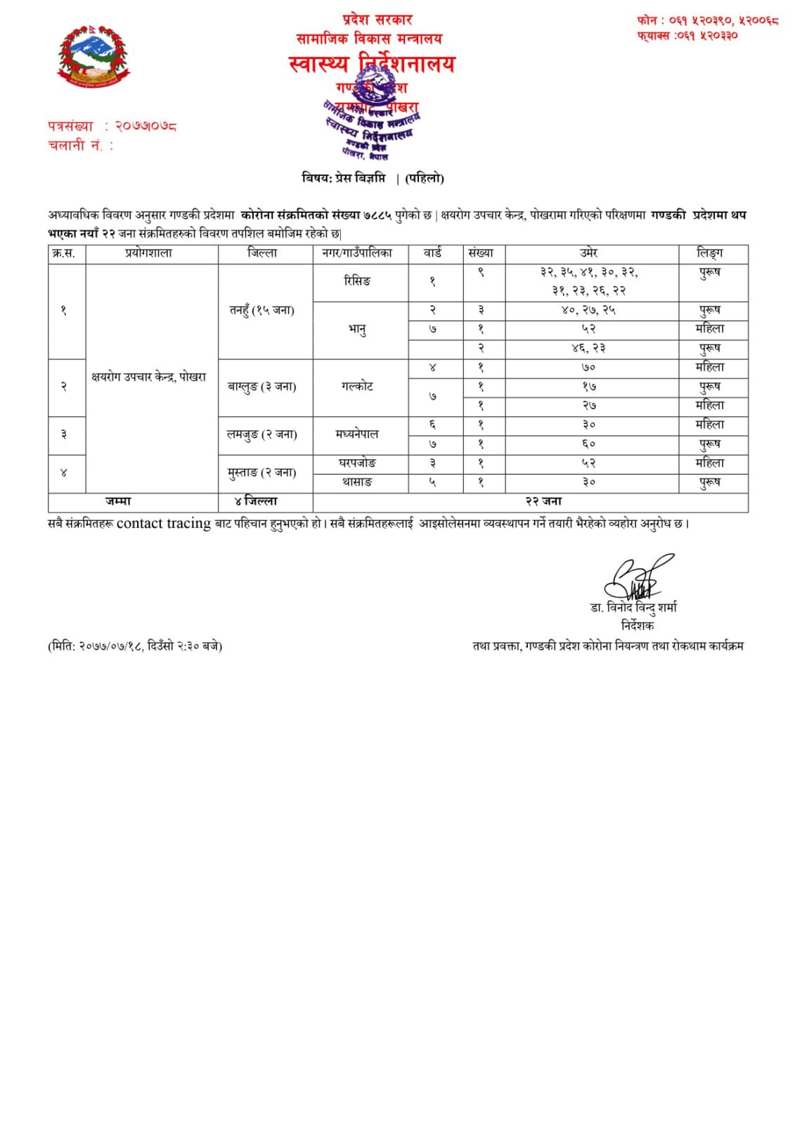 स्वास्थ्य निर्देशनालय गण्डकीले आज दिउसो जारी गरेको विज्ञप्ति अनुसार गण्डकीका चार जिल्लाका २२ जनामा संक्रमण पुष्टि भएको हो ।तनहुँ, बाग्लुङ, लम्जुङ र मुस्ताङमा गरी २२ जनामा कोरोना संक्रमण पुष्टि भएको हो ।