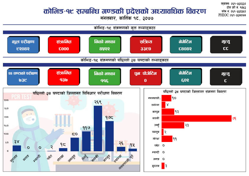 पोखरा, कात्तिक १८ गते । गण्डकी प्रदेशमा पछिल्लो २४ घण्टामा १३७ नयाँ संक्रमित थपिएका छन् ।