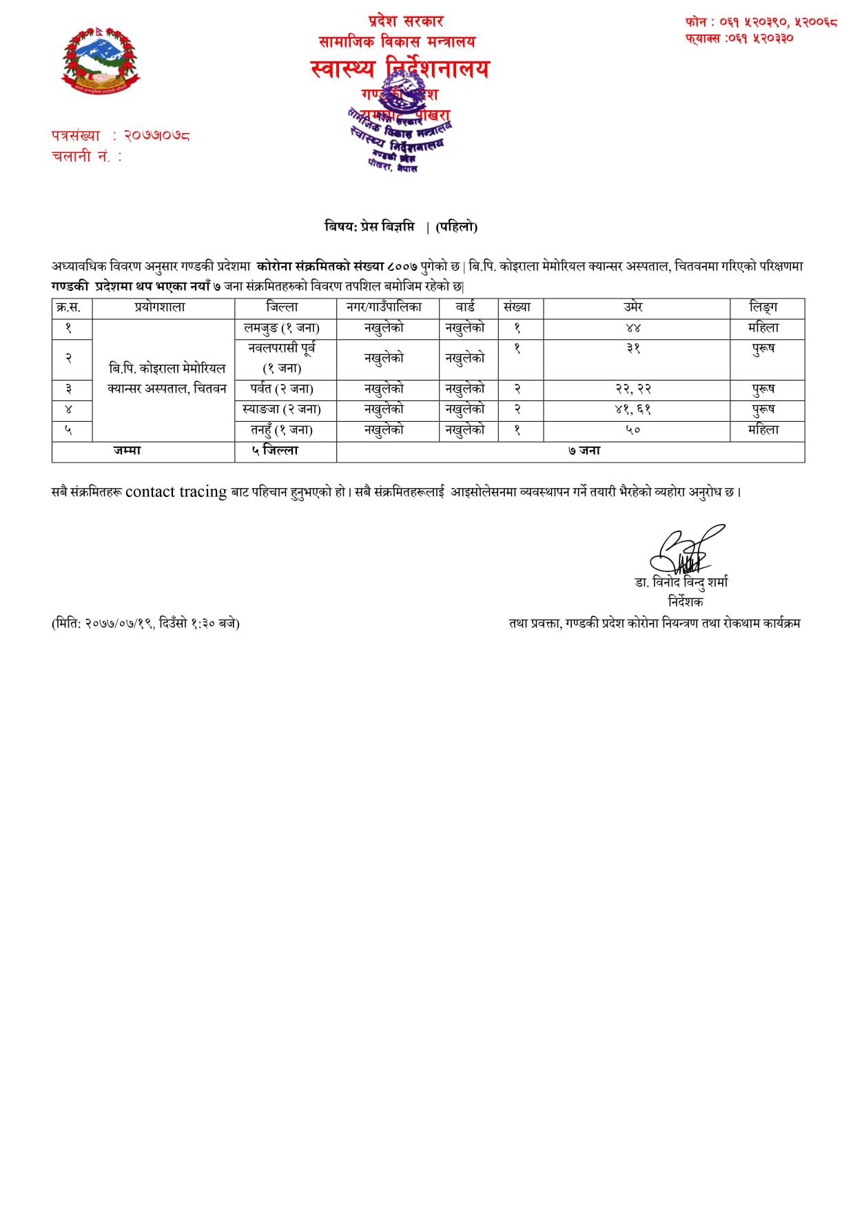 स्वास्थ्य निर्देशनालय गण्डकीले बुधबार दिउसो विज्ञप्ति जारी गदै गण्डकीका पाँच जिल्लामा सात जना थपिएको जनाएको छ । नवलपरासी, लम्जुङ, पर्वत, स्याङजा र तनहुँमा गरी सात जना थपिएका हुन् ।