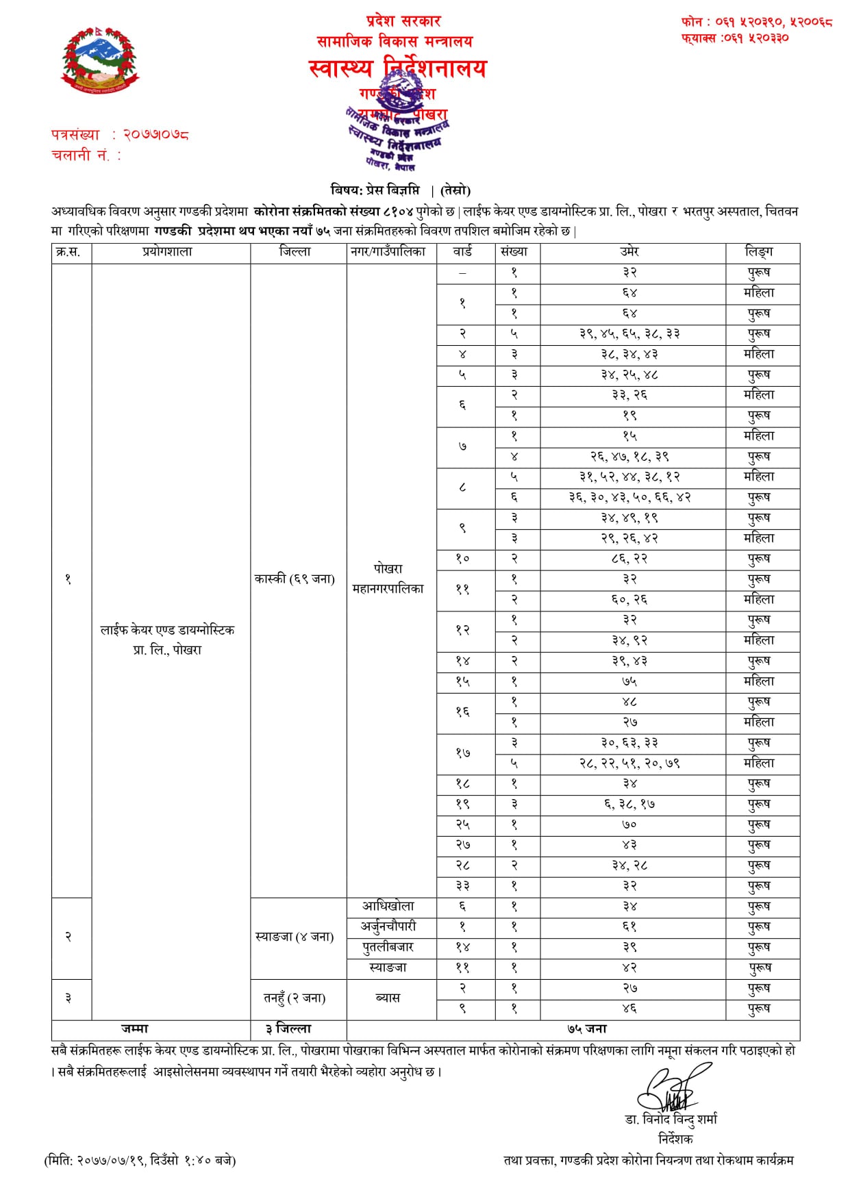 स्वास्थ्य निर्देशनालय गण्डकीले बुधबार दिउँसो जारी गरेको विज्ञप्तिमा गण्डकीका तीन जिल्लामा ७५ जना संक्रमित थपिएको जनाएको छ ।