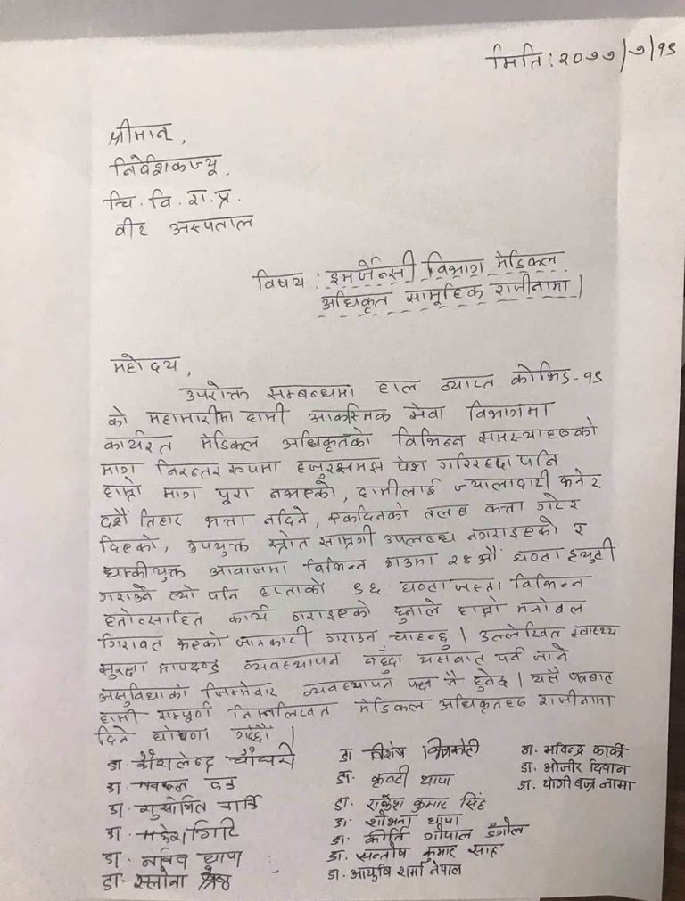 अस्पतालको निर्देशकलाई बुझाएको राजीनामा पत्रमा लेखिएको छ, ‘माहामारीमा काम गर्दा हाम्रा माग हजुरहरु सामु पेस गरिरहँदा पनि बेवास्ता गरेको, आवश्यक सुरक्षा सामग्री उपलब्ध नगराएको, ज्यालादारी भनेर अपमानित गर्दै दसैँतिहार भत्ता समेत नदिएकाले हाम्रो मनोवल गिरेको जानकारी गराउन चाहान्छौँ ।’ धम्कीसहित जवरजस्ती हप्ताको ९६ घण्टासम्म ड्युटी गराएको तर, सेवा सुविधा उपलब्ध नगराएको पनि चिकित्सकहरुले पत्रमा उल्लेख गरेका छन् ।