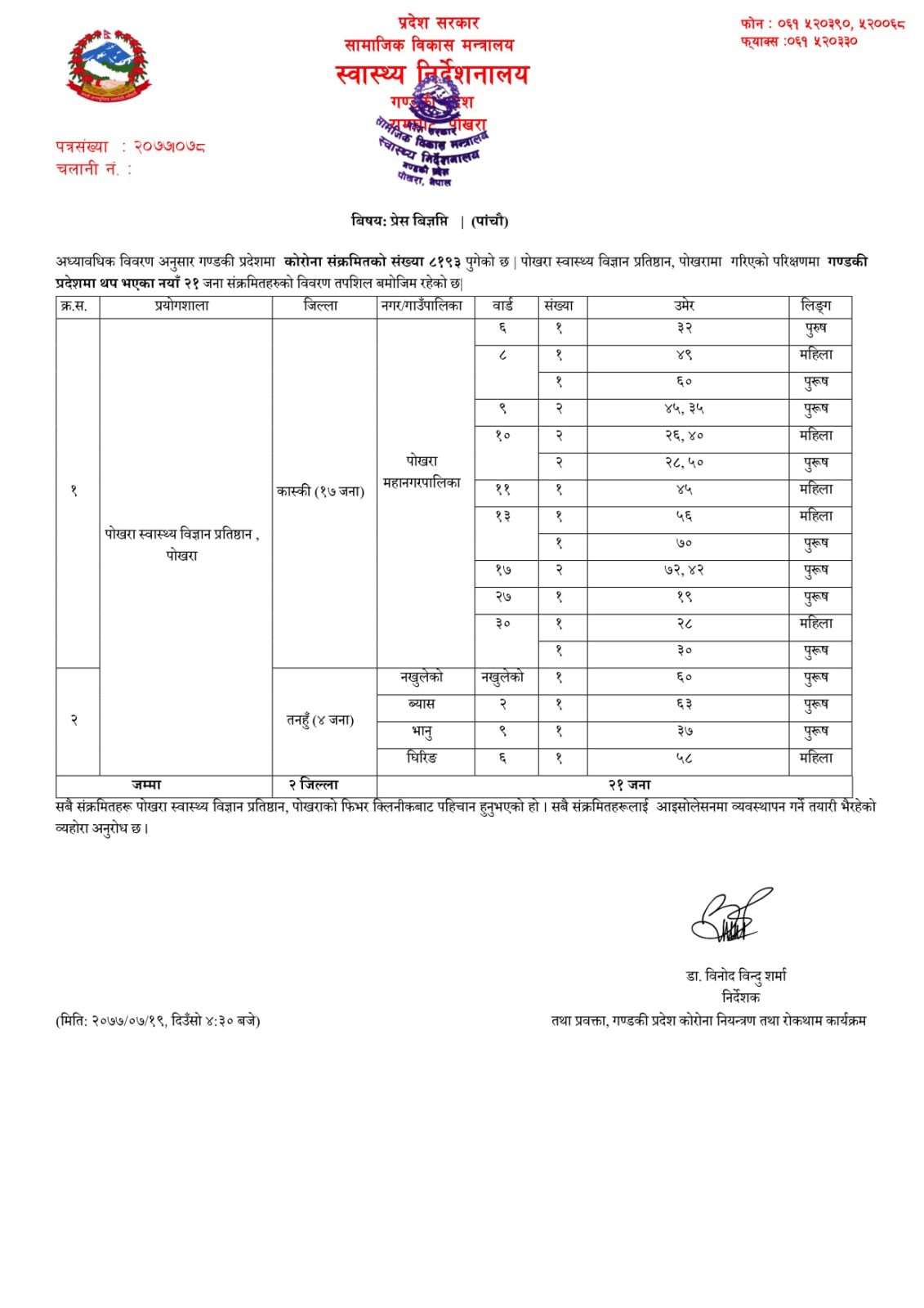 पोखरा, कात्तिक १९ गते । गण्डकी प्रदेशमा फेरी २१ संक्रमित थपिएका छन् । स्वास्थ्य निर्देशनालय गण्डकीका अनुसार गण्डकीका दुई जिल्लाका २१ जनामा कोरोना संक्रमण पुष्टि भएको हो ।