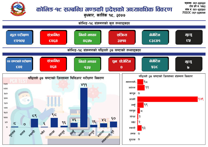 पोखरा, कात्तिक १९ गते । गण्डकी प्रदेशमा पछिल्लो २४ घण्टामा २६४ जनामा कोरोना भाइरस संक्रमण पुष्टि भएको छ । स्वास्थ्य निर्देशनालय गण्डकी प्रदेशले जारी गरेको विवरण अनुसार सबै भन्दा धेरै १७९ कास्की जिल्ल्लामा संक्रमित थपिएका छन् ।