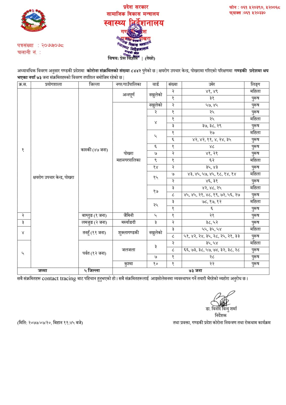 गण्डकी प्रदेशमा संक्रमितको संख्या आठ हजार ४४२ पुगेको प्रदेश स्वास्थ्य निर्देशनालय गण्डकीले जनाएको छ ।