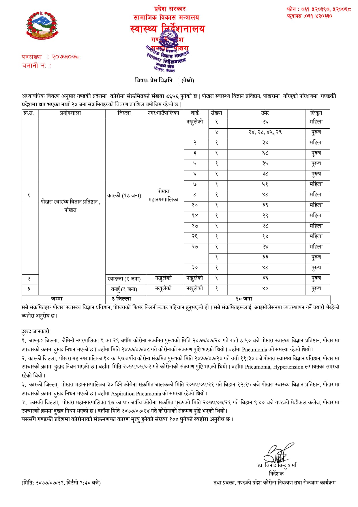 त्यस्तै पोखरा महानगरपालिकाका ३० दिने कोरोना सक्रमित बालकको आज बिहान १२ः१५ बजे पोखरा स्वास्थ्य बिज्ञान प्रतिष्ठानमा उपचारका क्रममा मृत्यु भएको छ ।