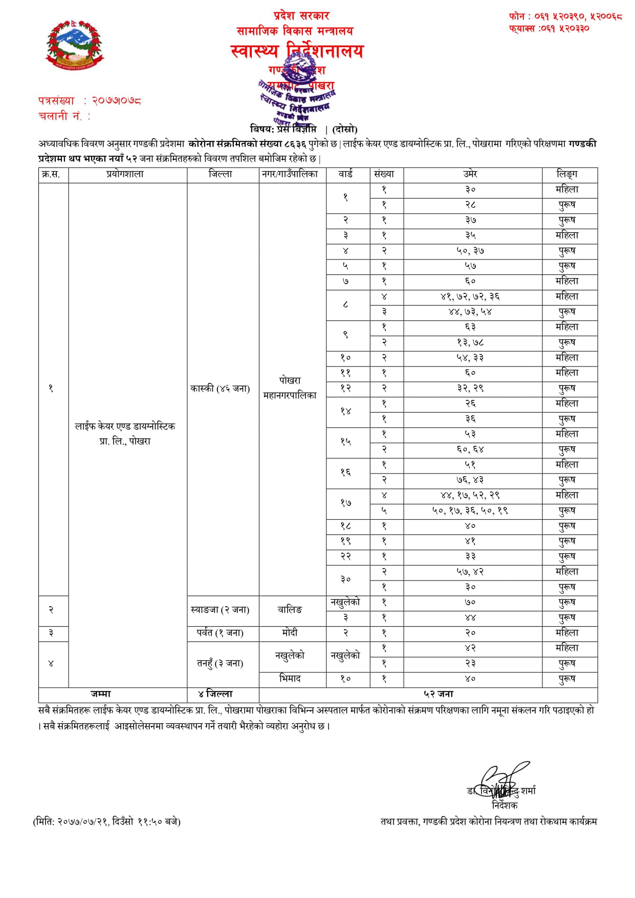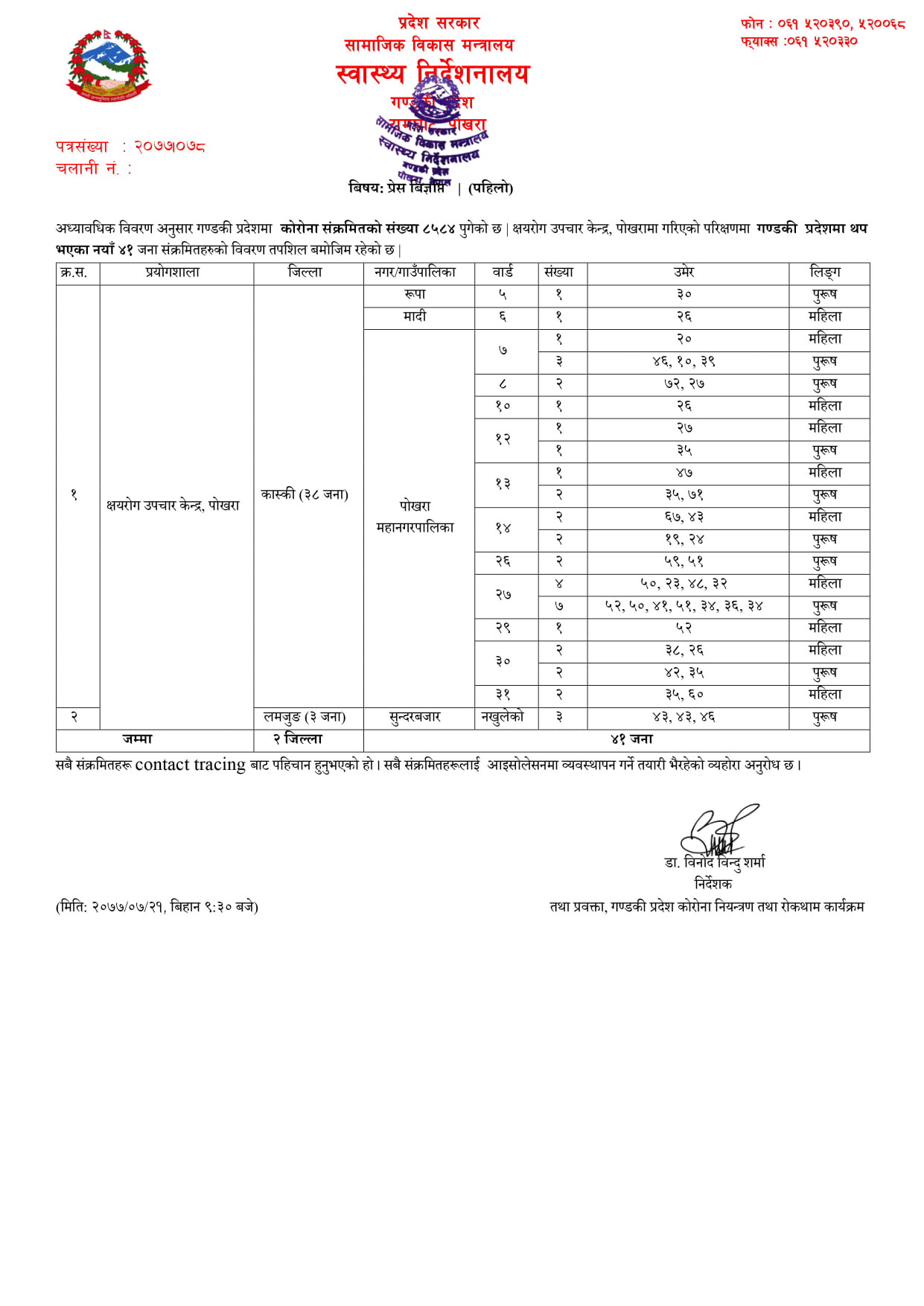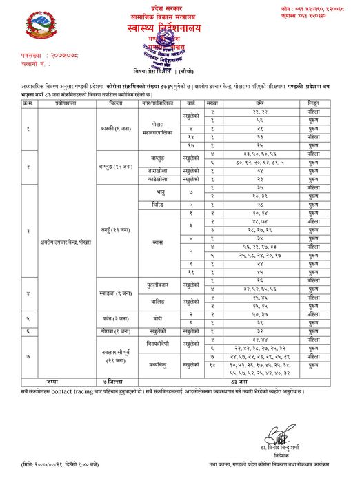 थपिएका मध्य पोखरा महानगरपालिका मात्रै १०८ जना रहेका छन् ।त्यस्तै स्याङजामा ३२, तनहुँमा २७, नवलपरासीमा २९, बाग्लुङमा १२, लम्जुङमा ३, पर्वतमा २ र गोरखामा १ जना संक्रमित थपिएका छन् । सबै कन्ट्याक्ट टेसिङबाट पुष्टि हुनुभएको हो । त्यस्तै गण्डकी प्रदेशमा एक महिने शिशु सहित चार जनाको मृत्यु भएको छ ।