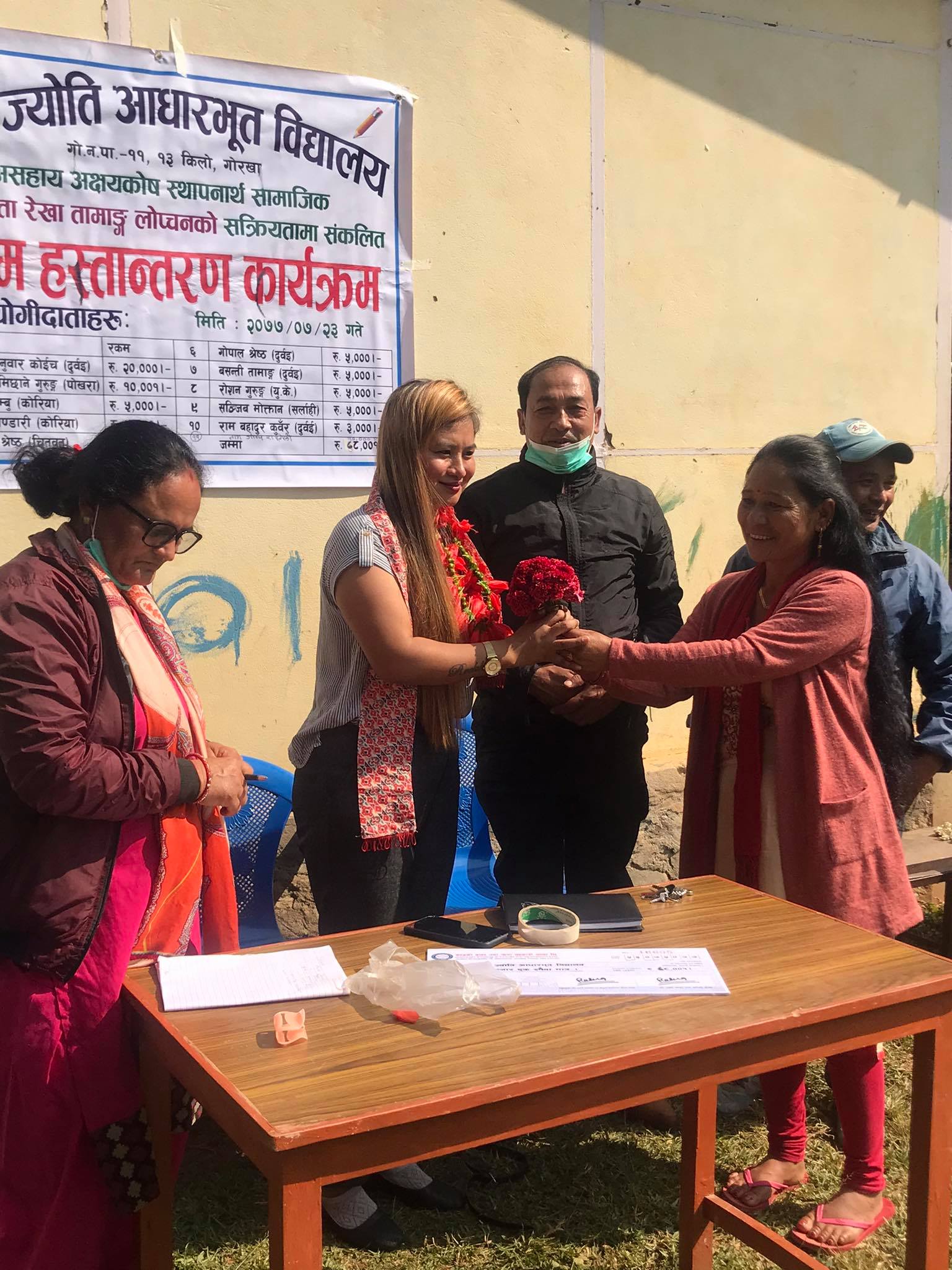 उक्त रकमले विद्यालयमा अक्षयकोष स्थापना गर्ने गरी हस्तान्तरण गरेको हुँ’ उनले भनिन् ‘अक्षयकोषबाट आएको ब्याजले विद्यालयले त्यहाँ पढ्ने असाहाय विद्यार्थीको शैक्षिक स्तरवृद्धीमा खर्च गर्नेछ ।’ नबिन सुनारले दुवईबाट २० हजार, दुर्गा लामिछाने गुरुङले पोखराबाट १० हजार एक, अर्का एक ब्यक्तिबाटबा १० हजार, इन्द्र लिम्बु, रमेश भण्डारी, जितेन्द्र श्रेष्ठ, गोपाल श्रेष्ठ, बसन्ती तामाङ, रोशन गुरुङ, सञ्जित मोक्तान, रामबहादुर कुँवरले पाँच÷पाँच हजार सहयोग गरेका छन् ।