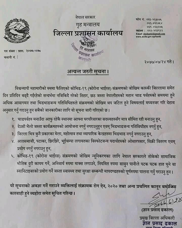 पोखरा, कात्तिक २४ गते । जिल्ला प्रशासन कार्यालय कास्कीले आफु रहेकै स्थानमा रहेर आफना घरपरिवारका सदस्यहरुसंग मात्र सीमित रही चाडपर्वहरु मनाउन अनुरोध गरेको छ ।