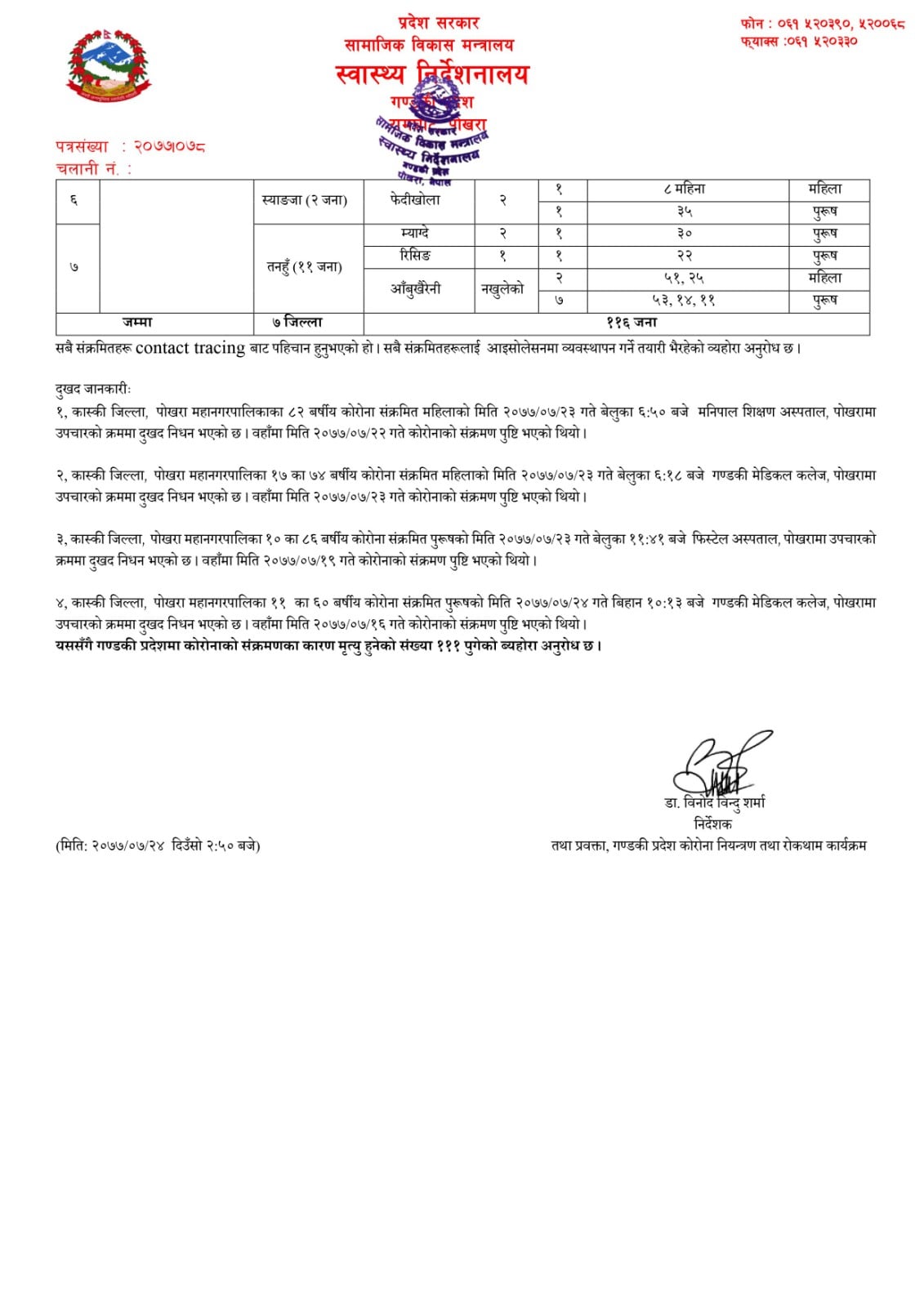प्रदेश स्वास्थ्य निर्देशनालयले विज्ञप्ती जारी गरी पोखरा–१७ का ७४ वर्षीय संक्रमित महिलाको गण्डकी मेडिकल कलेज, पोखरा वडा नं १० का ८६ वर्षीय पुरुषको फिस्टेल अस्पताल, पोखरा वडा नं ११ का ६० वर्षीय संक्रमित पुरुषको गण्डकी मेडिकल कलेज तथा पोखराकै ८२ वर्षीया महिलाको मणिपाल शिक्षण अस्पतालमा उपचारका क्रममा मृत्यु भएको जनाएको छ । यससँगै गण्डकी प्रदेशमा कोरोना संक्रमितबाट मृत्यु हुनेको संख्या १११ पुगेको छ ।