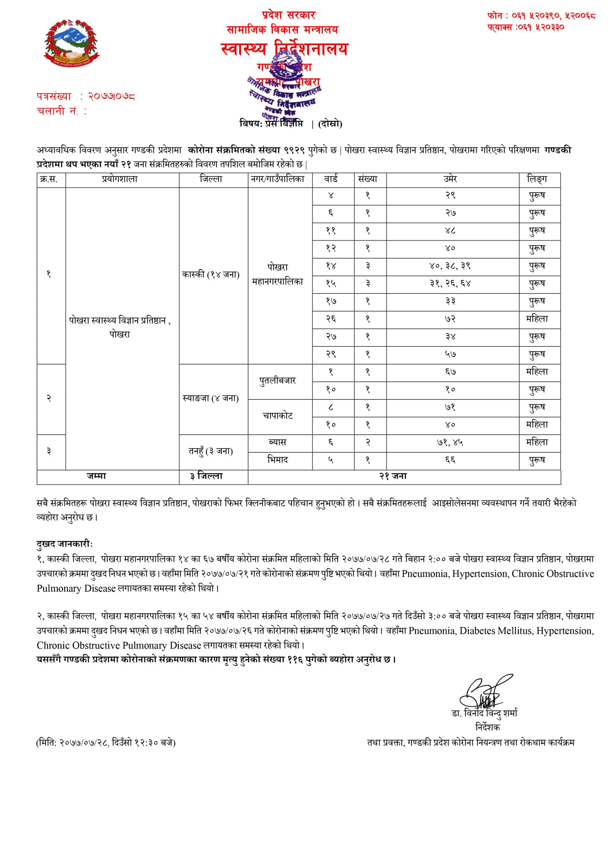 उहाँको पोखरा स्वास्थ्य विज्ञान प्रतिष्ठानमा उपचारका क्रममा ज्यान गएको स्वास्थ्य निर्देशनालय गण्डकी प्रदेशले जनाएको छ । आज दिउसो तीन बजे मृत्यु भएको जनाएको छ । शुक्रबार विहान पोखरा स्वास्थ्य बिज्ञान प्रतिष्ठानमा उपचार पोखरा–१४ की ६७ वषीय महिलाको मृत्यु भएको थियो । शुक्रबार विहान २ बजेट निधन भएको पोखरा स्वास्थ्य बिज्ञान प्रतिष्ठानले जनाएको छ । उहाँ कात्तिक २१ गते प्रतिष्ठानमा भर्ना भएको बताइएको छ ।