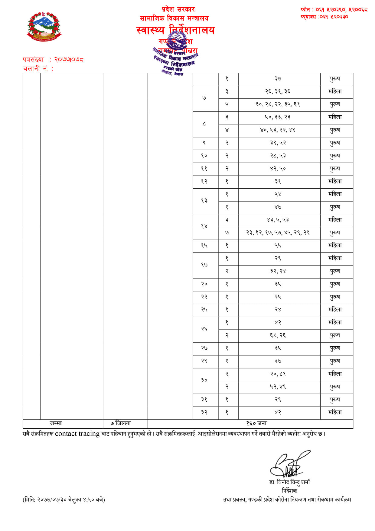 पोखरा, कात्तिक ३० गते । गण्डकी प्रदेशमा एकै पटकमा १६० संक्रमित थपिएका छन् । आइतबार ४ः५० बजे स्वास्थ्य निर्देशनालय गण्डकीले जारी गरेको चौथो विज्ञप्तिमा कास्कीका ७८ सहित गण्डकी एकै पटकमा यति धेरै नयाँ संक्रमित थपिएका हुन् । नवलपरासी पूर्वका ३०, गोरखा १४, लम्जंगका १४, मुस्तांगका १३,बाग्लंगका ८ र पर्वतका ३ जना रहेका छन् ।